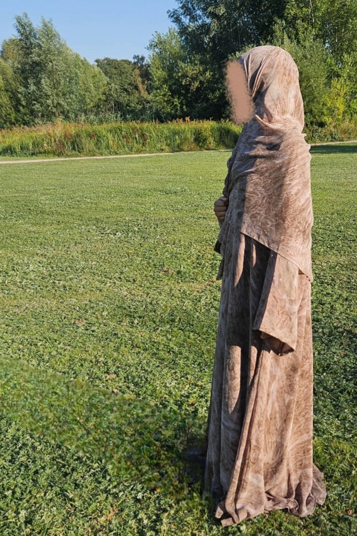 A subtle yet striking piece – the Amani Abaya, featuring an elegant mocha tiedye print that adds depth to a timeless silhouette. Crafted from premium quality korean chiffon,and lined with premium chiffon, this abaya drapes beautifully and feels effortlessly luxurious against the skin.