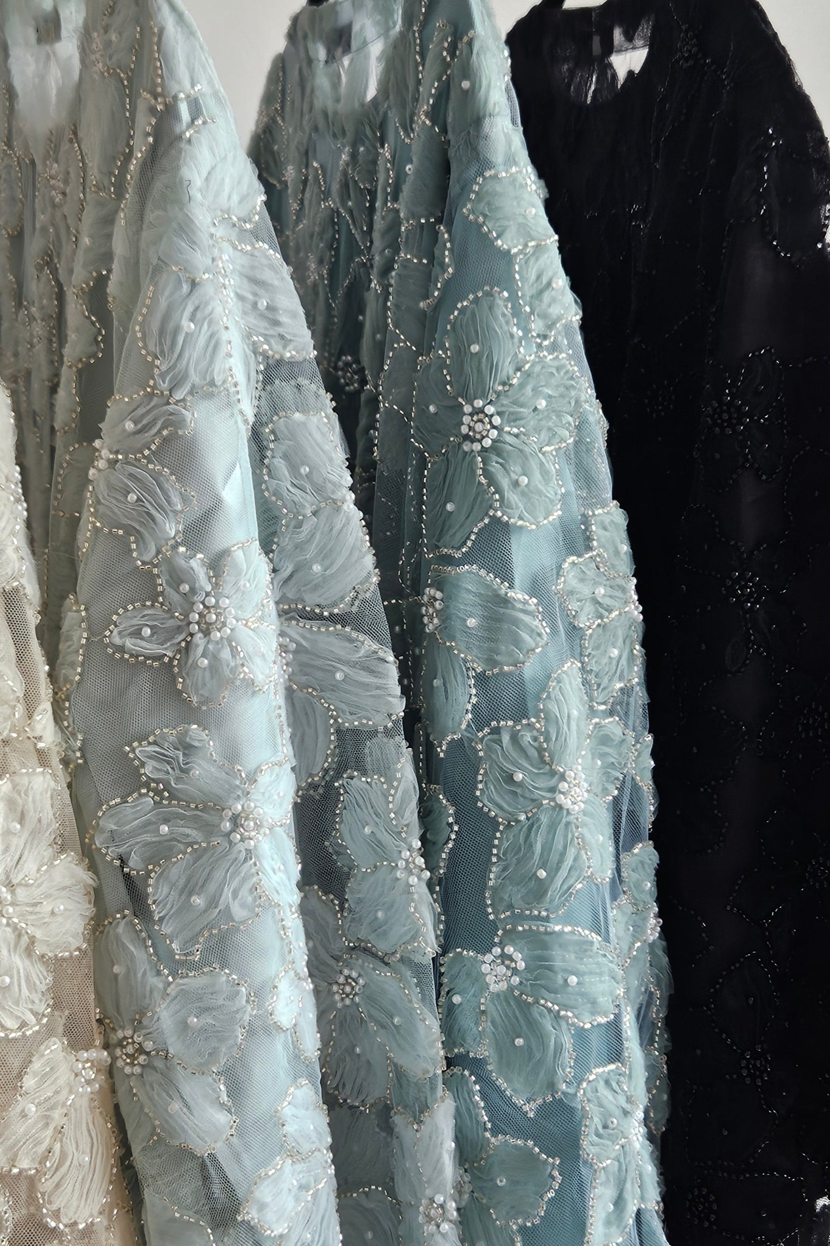 Introducing the Amara abaya, a stunning piece of occasionwear. This abaya comes in 3 beautiful shades and is made of premium floral mesh lace featuring intricate beadwork. It comes with a long sleeve satin dress and an additional matching chiffon hijab