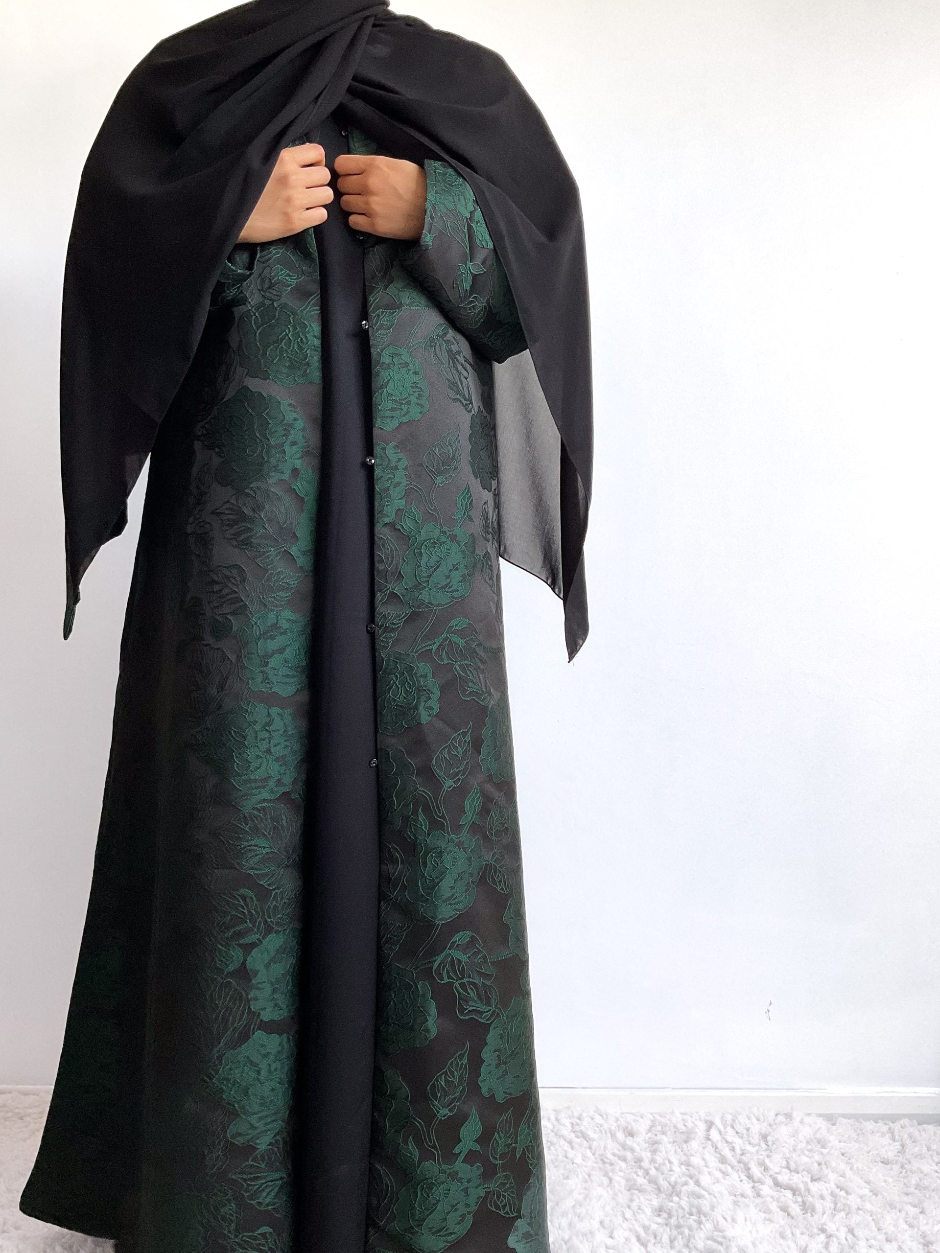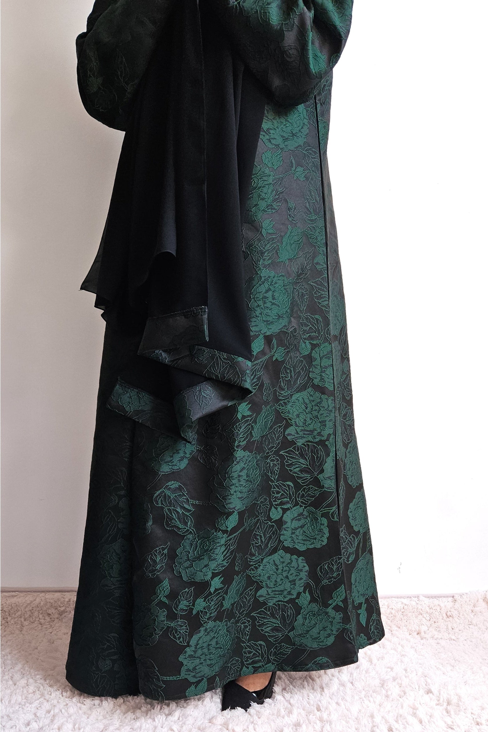 Introducing our luxurious occasionwear abaya in a black and deep emerald shade, tailored from an exclusive fukru jacquard fabric. Can be styled open or closed, with snap buttons down the abaya. Matching hijab included.