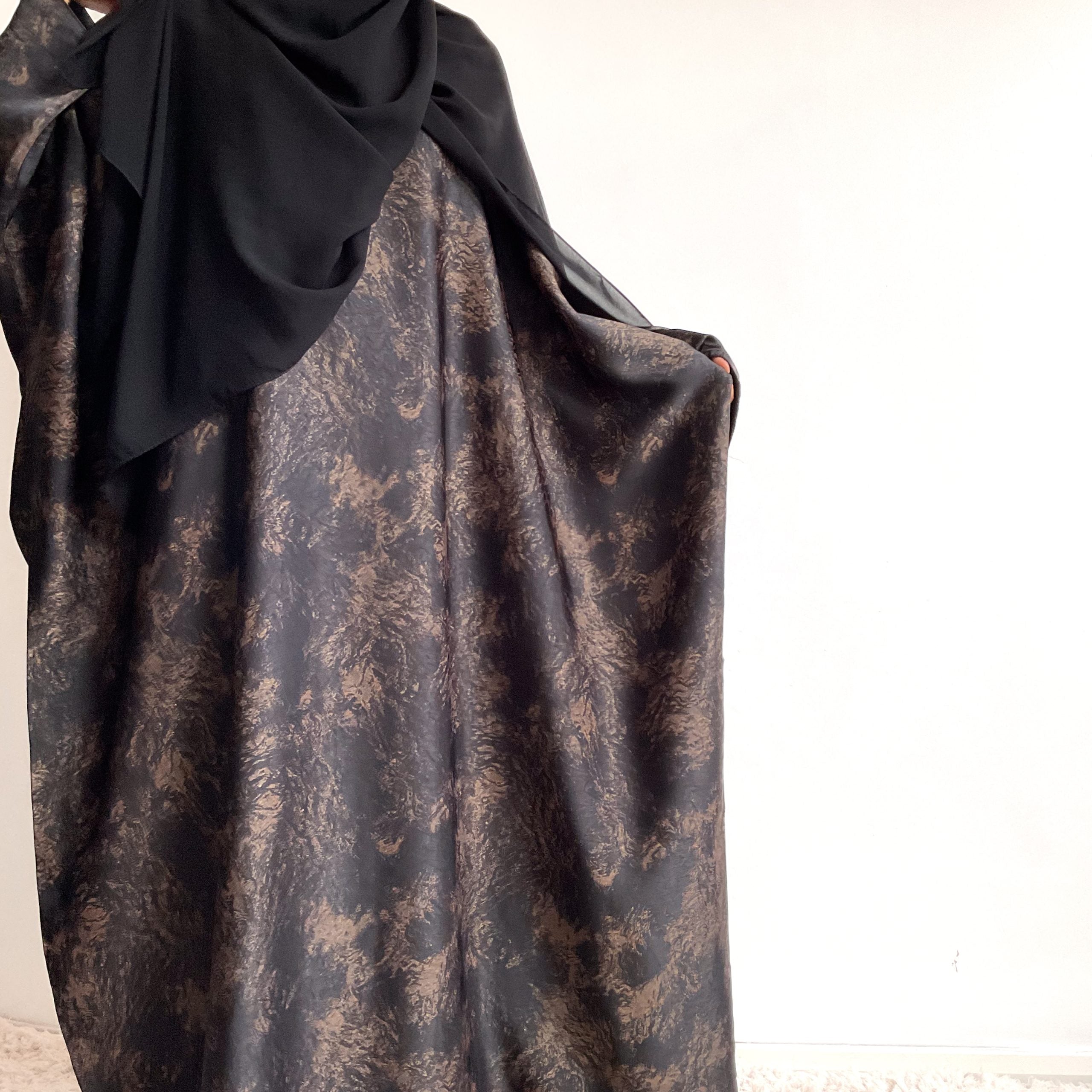 A subtle yet striking piece - the Aya Abaya, featuring an elegant bronze marble print that adds depth to a timeless silhouette. Crafted from premium quality fabric, this abaya drapes beautifully and feels effortlessly luxurious against the skin.