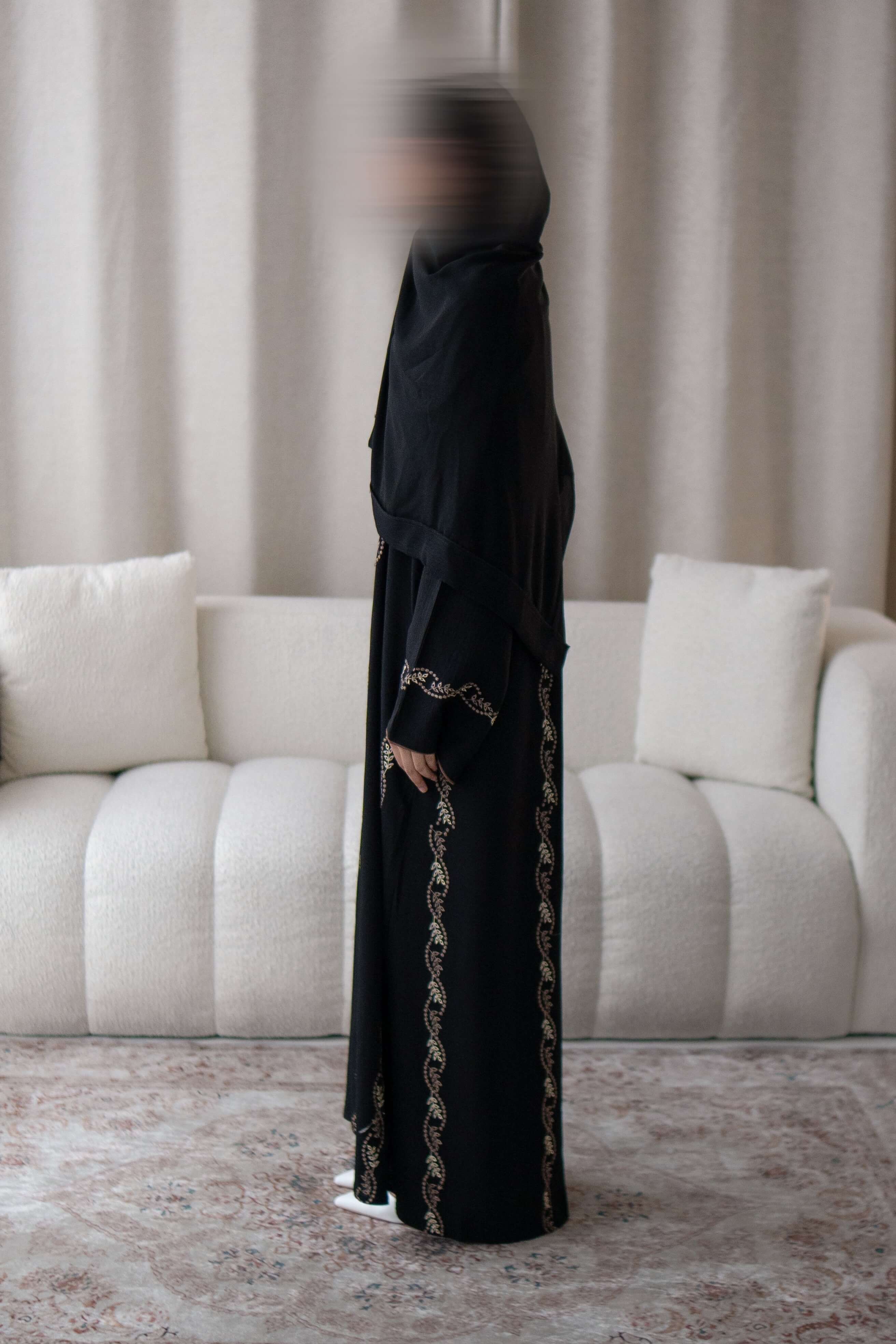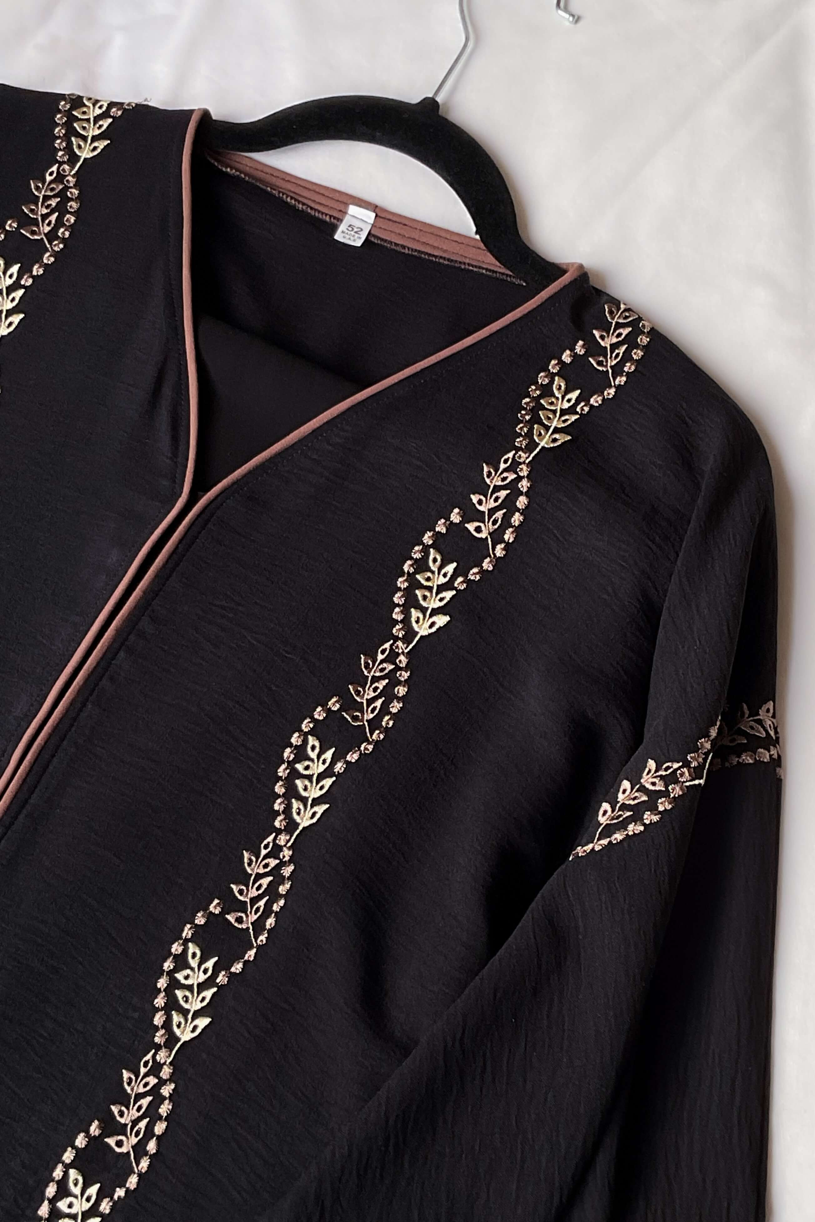 Timeless elegance meets everyday comfort in our Black Embroidered Abaya, beautifully crafted from soft cotton crepe fabric for a breathable, lightweight feel. Delicate dusky gold embroidery cascades along the front, back and sleeves.