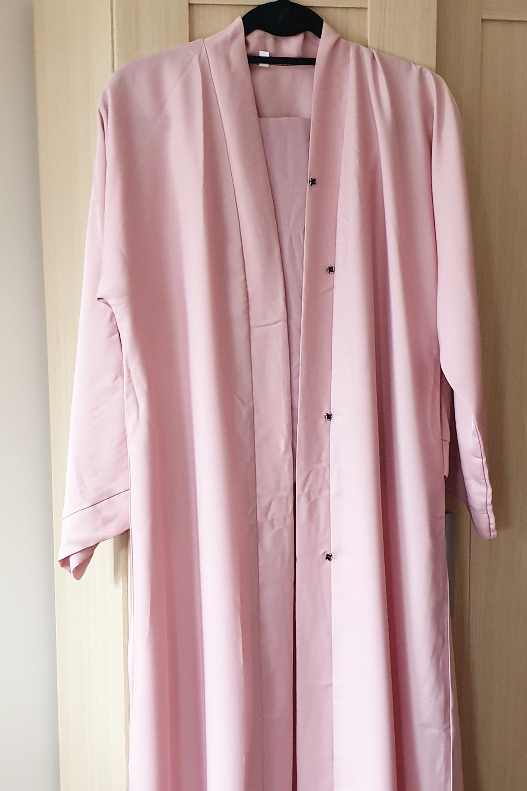 The abaya is open with buttons approximately half way down