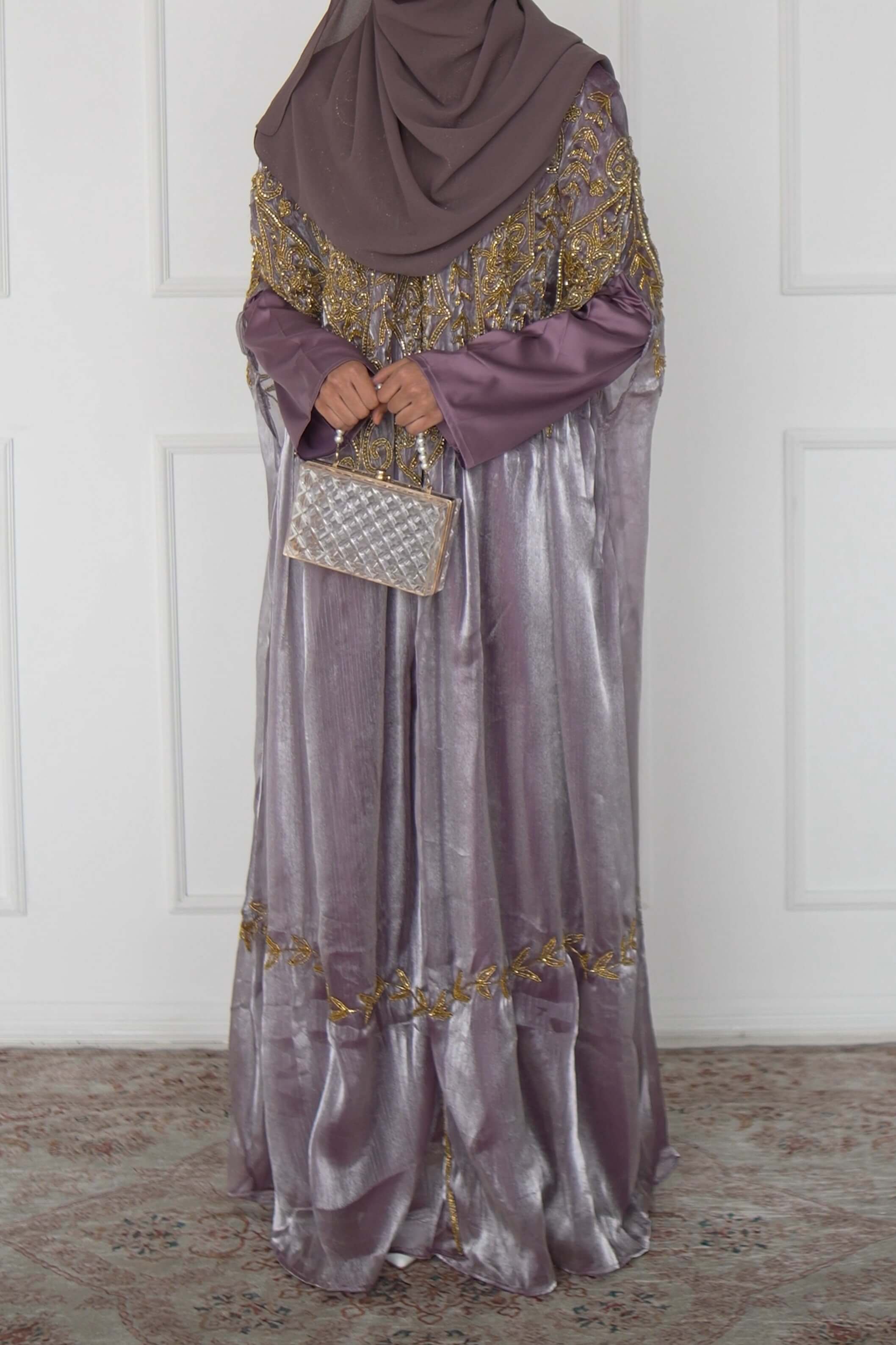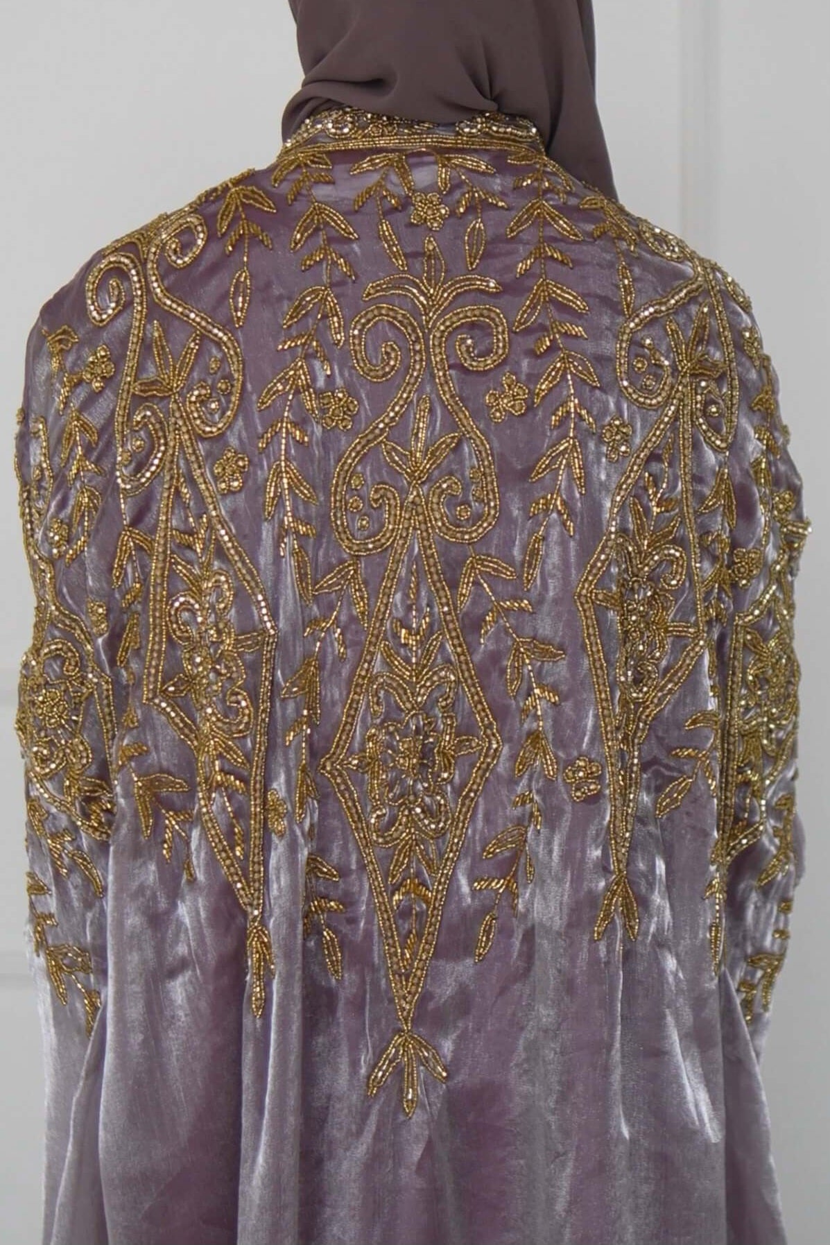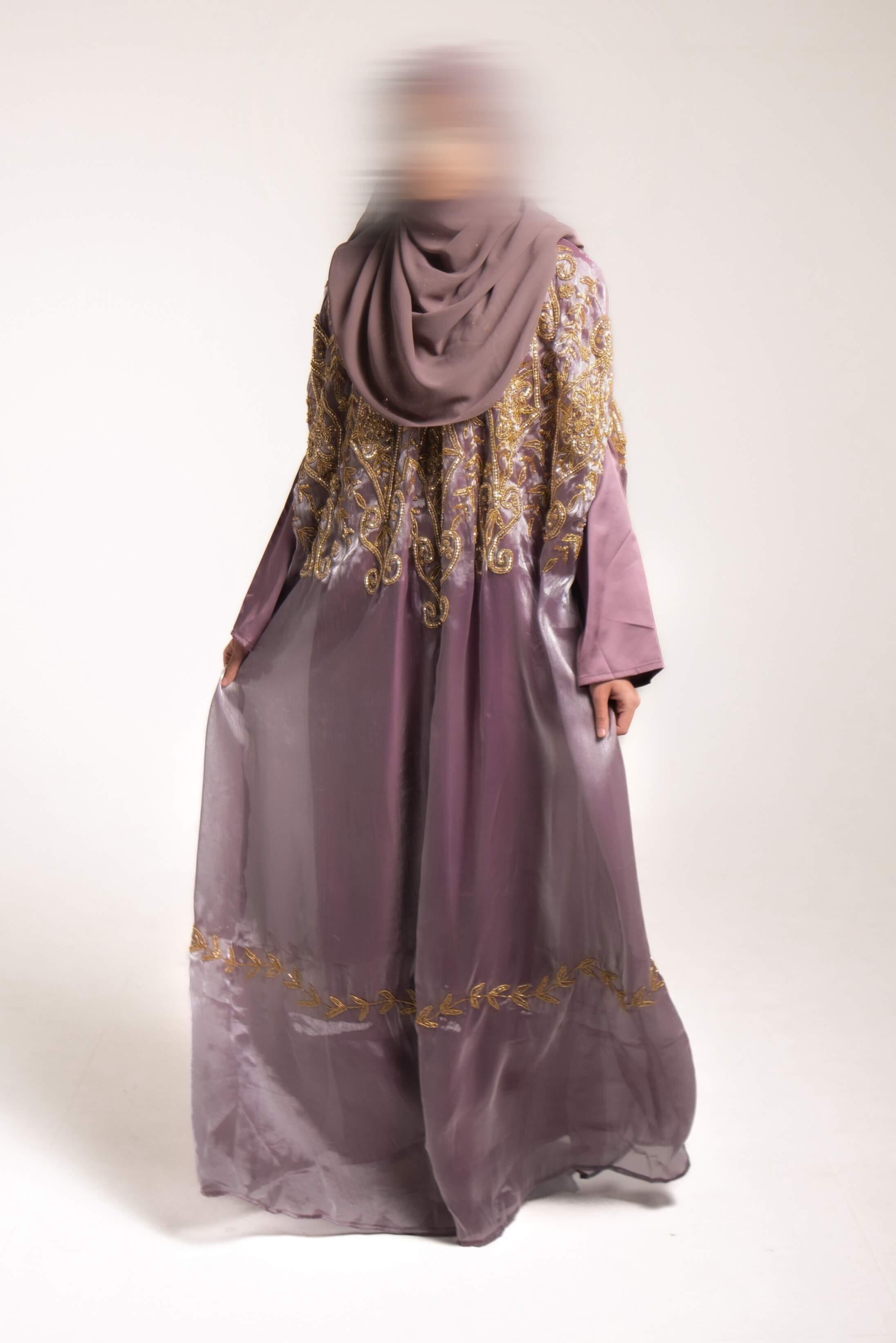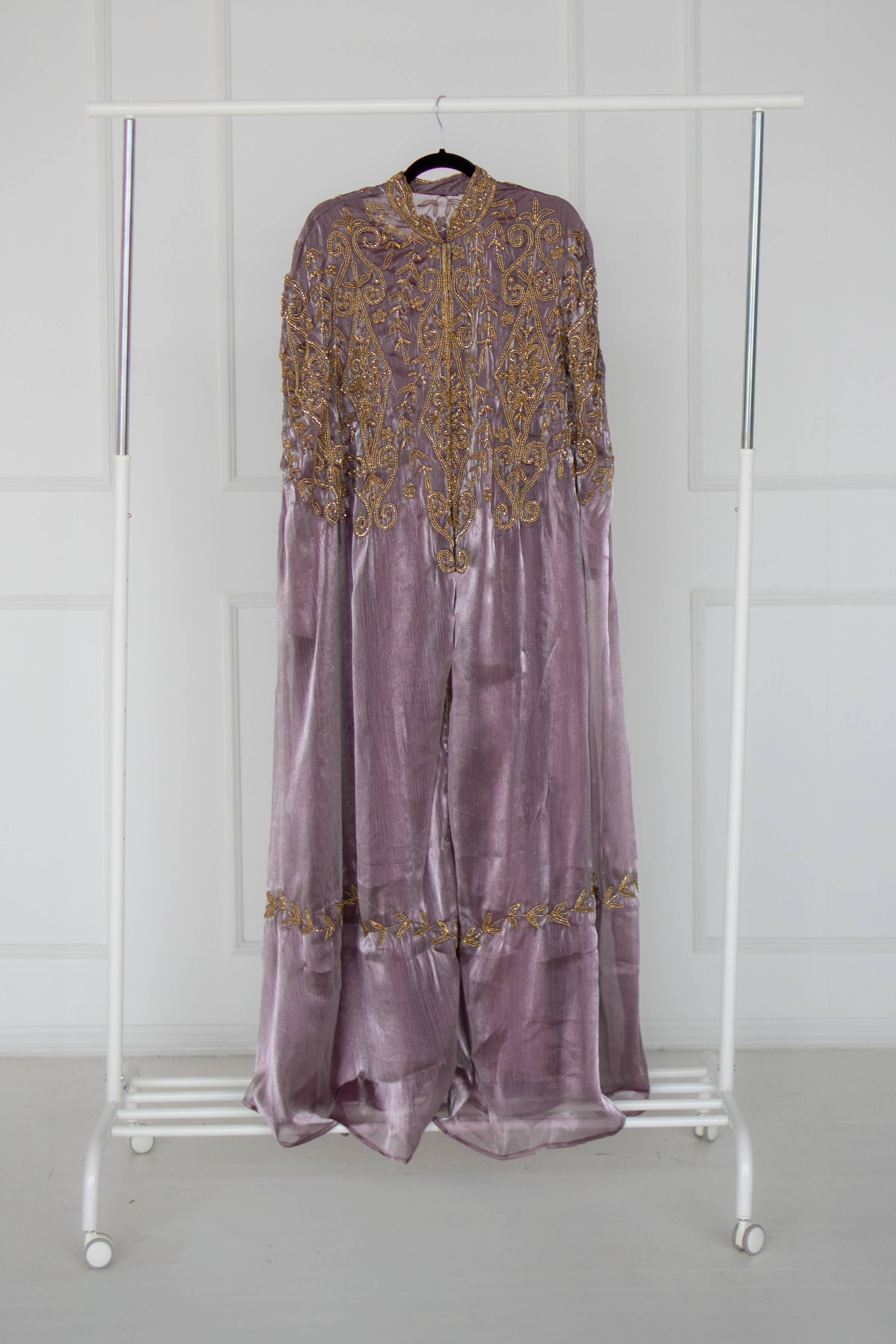 Designed to leave a lasting impression, this lilac organza silk cape features heavy gold beadwork across the front and back, creating a luminous, ethereal effect. Paired with a sleek long-sleeved inner dress in premium satin, it is a statement of refined glamour and timeless beauty.
