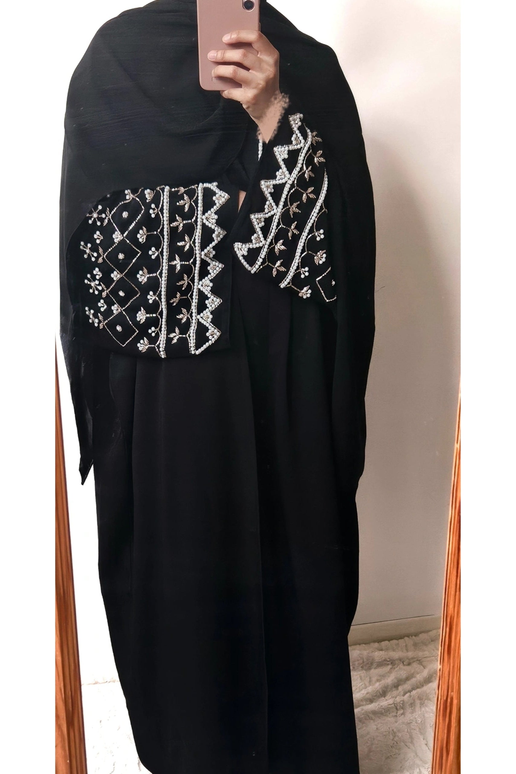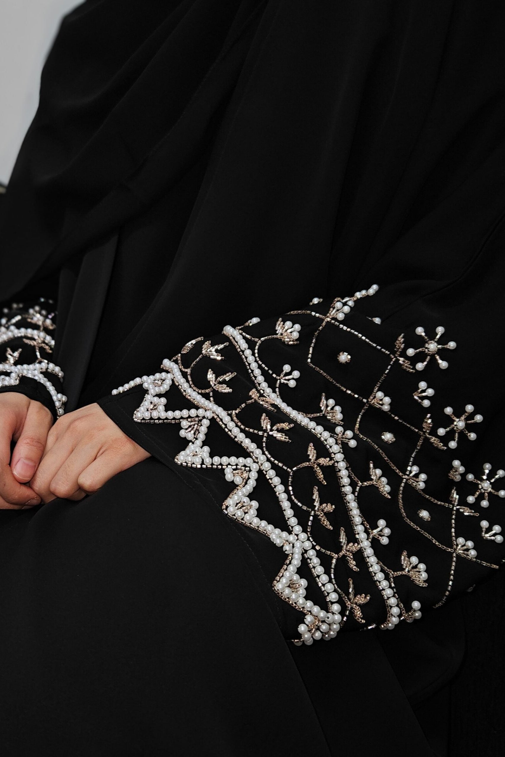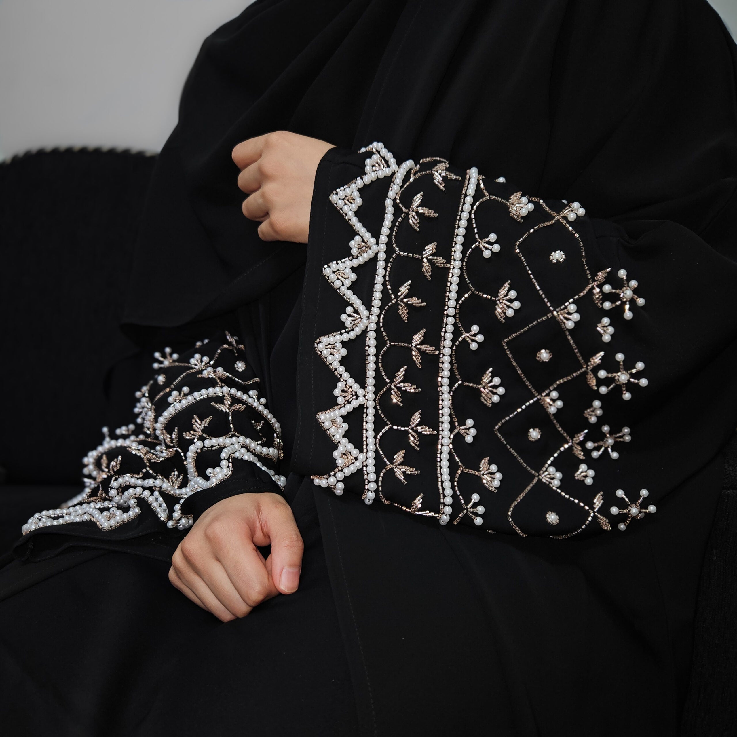 A flowy outer farasha made out of Korean nida, featuring extensive intricate bead and pearlwork on the sleeves.