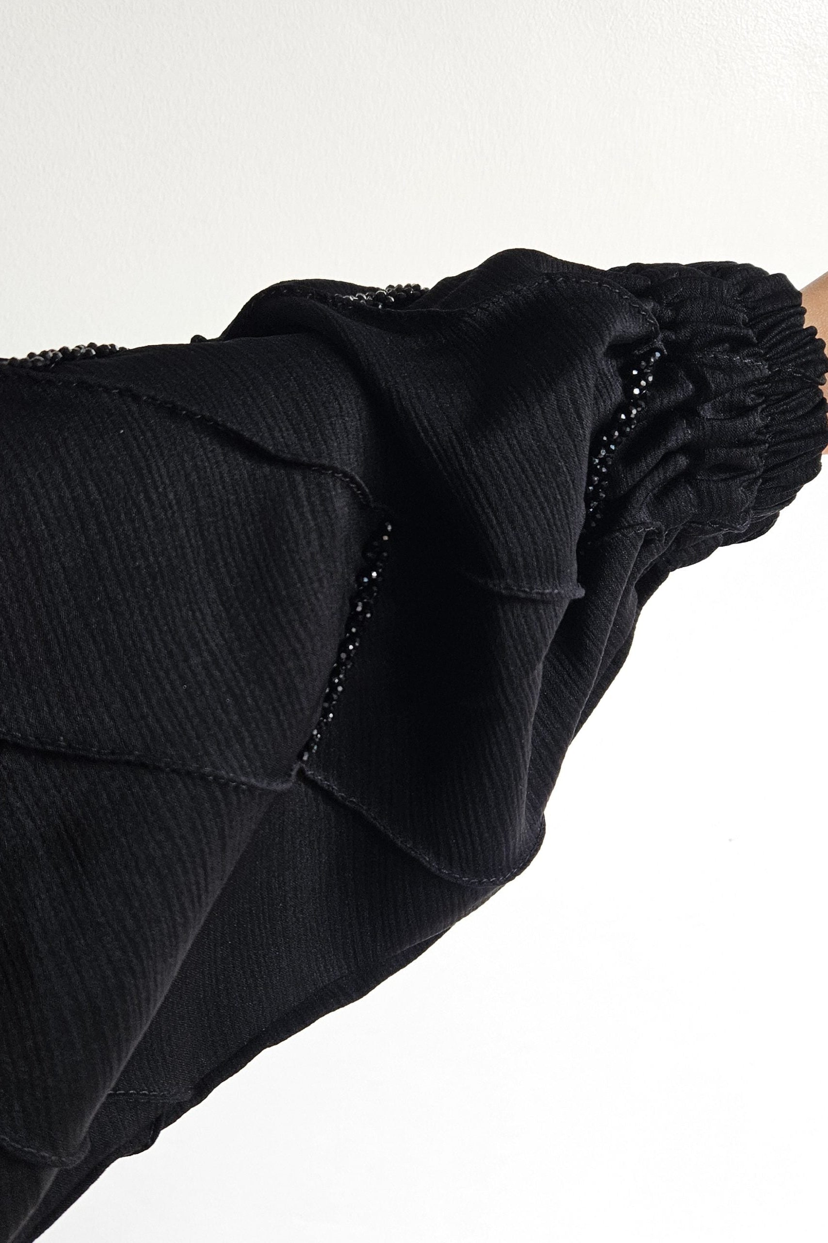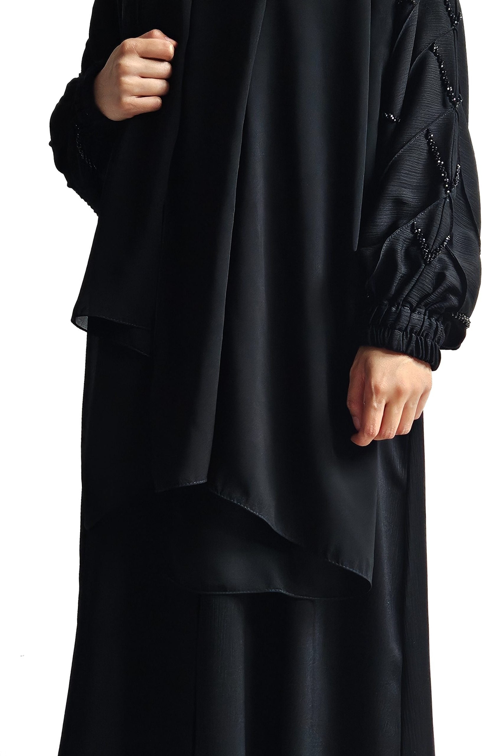 Introducing the Leyla Abaya, an open abaya in a classic black shade with handwork embellishments on the sleeves. Abaya comes with a matching chiffon scarf.
