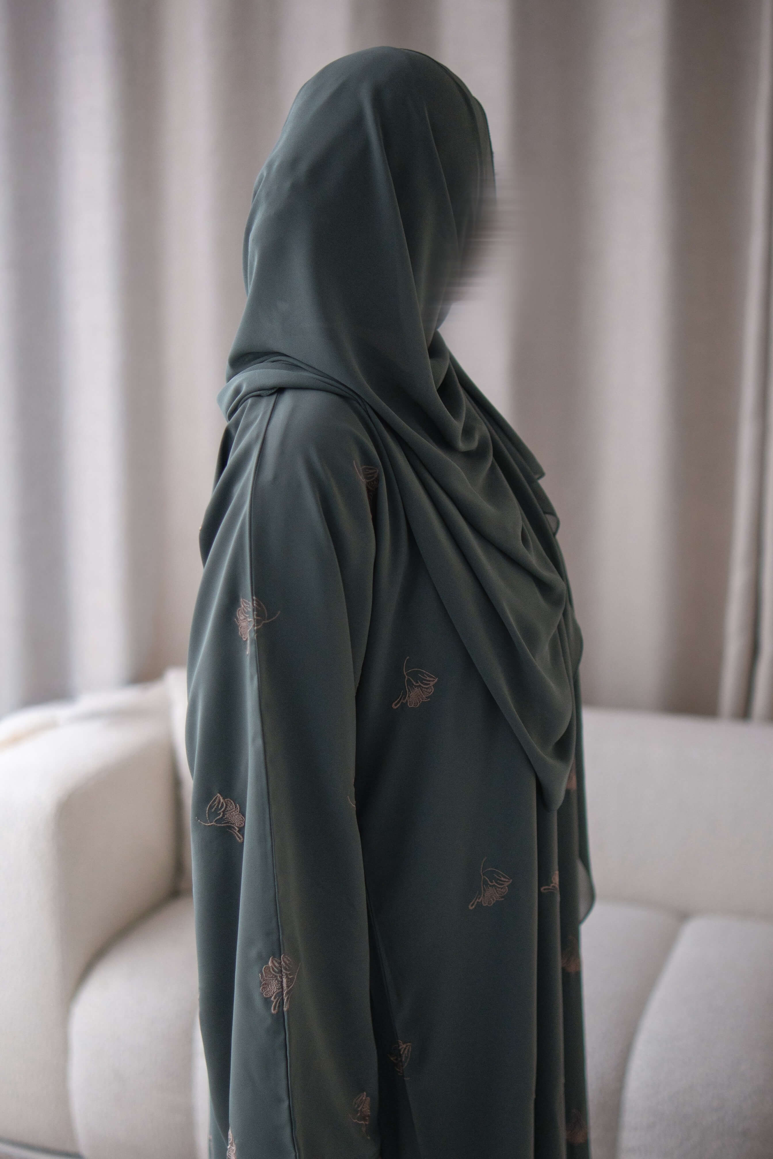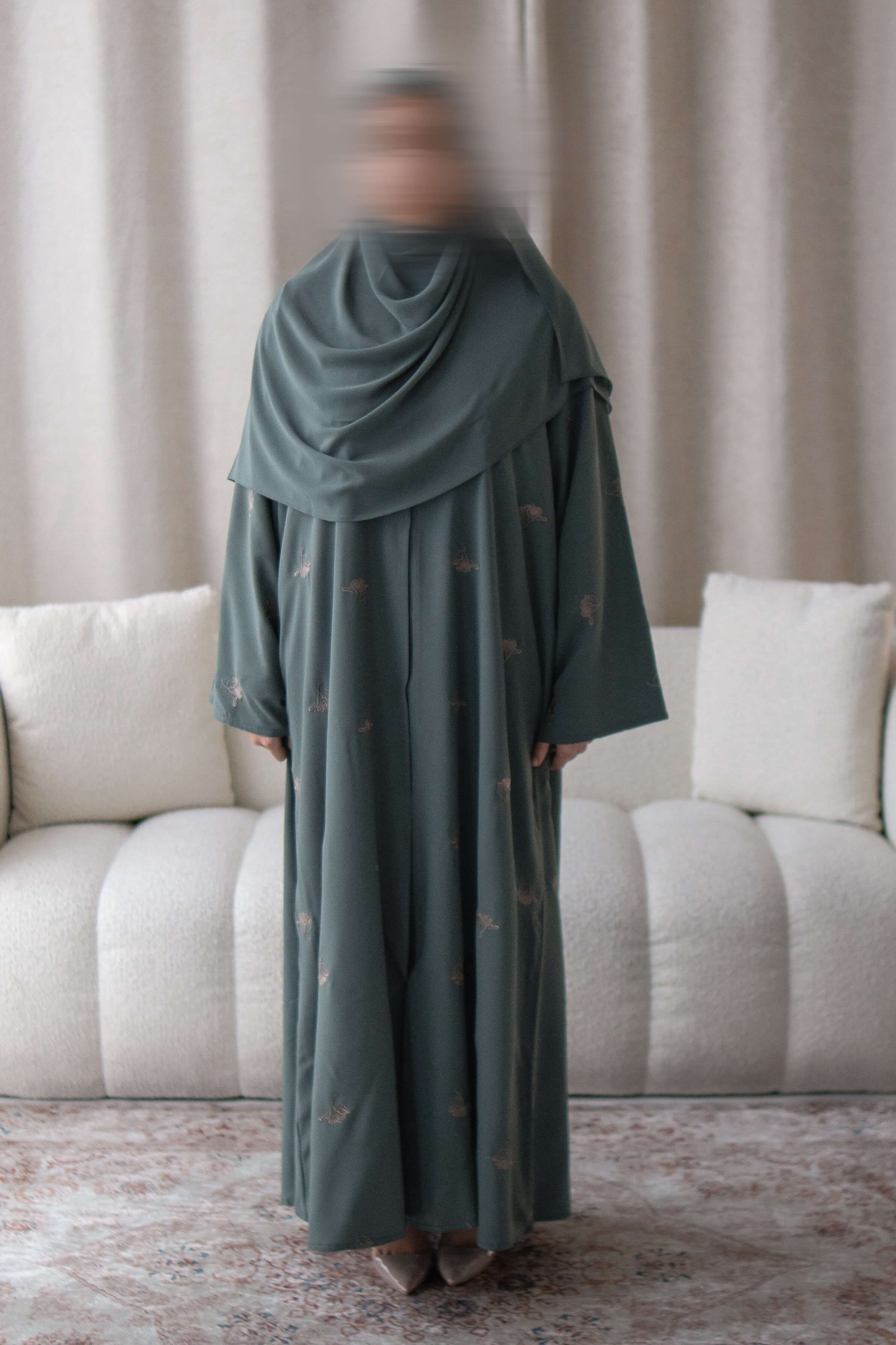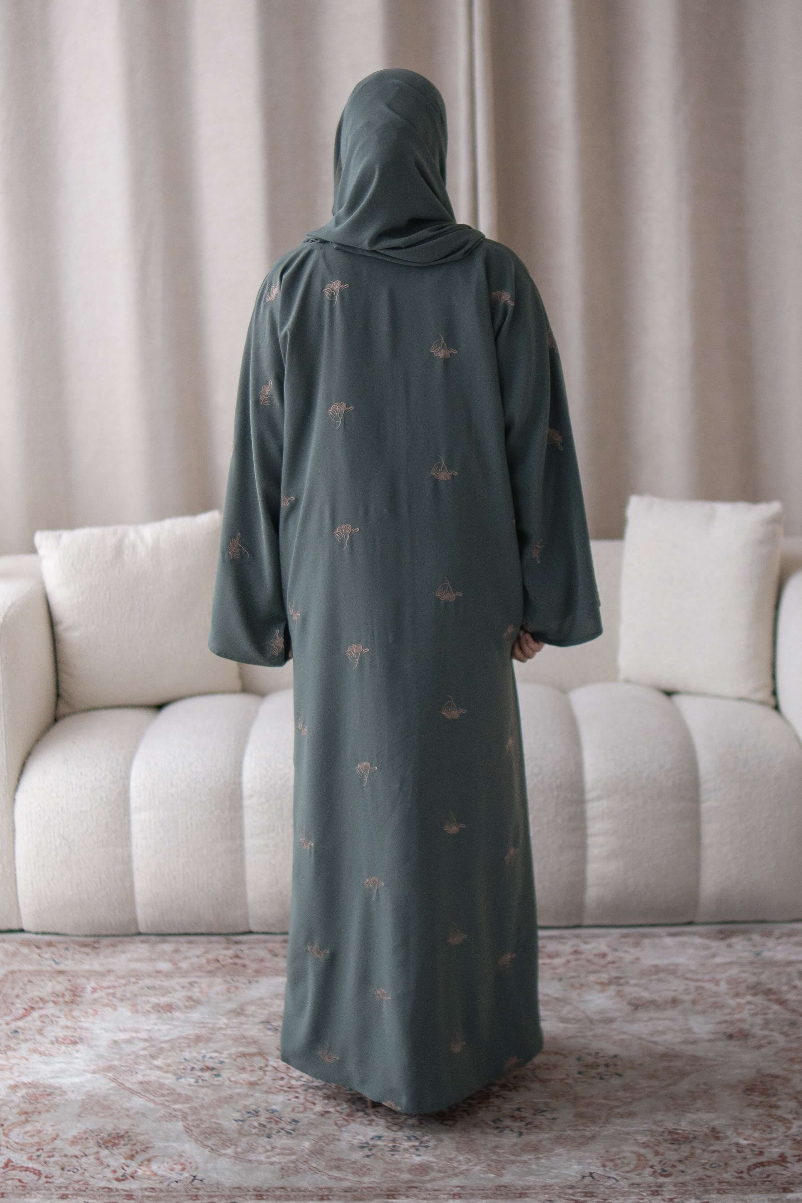 Soft flowing fabric, crafted in a vintage muted hue with subtle embroidery, a statement abaya that’s graceful in every season.