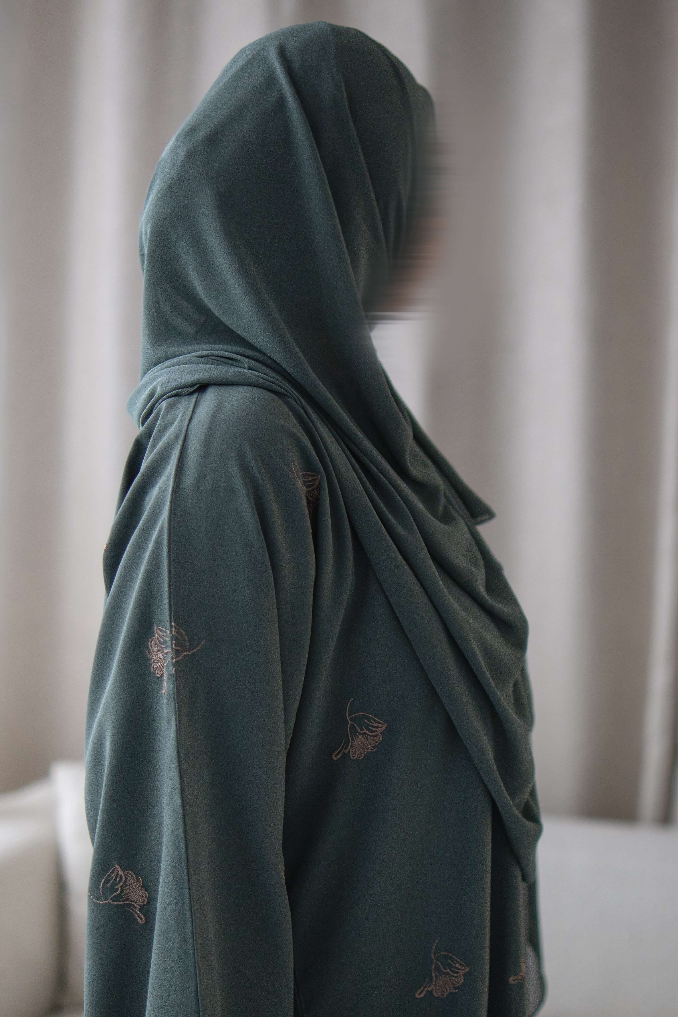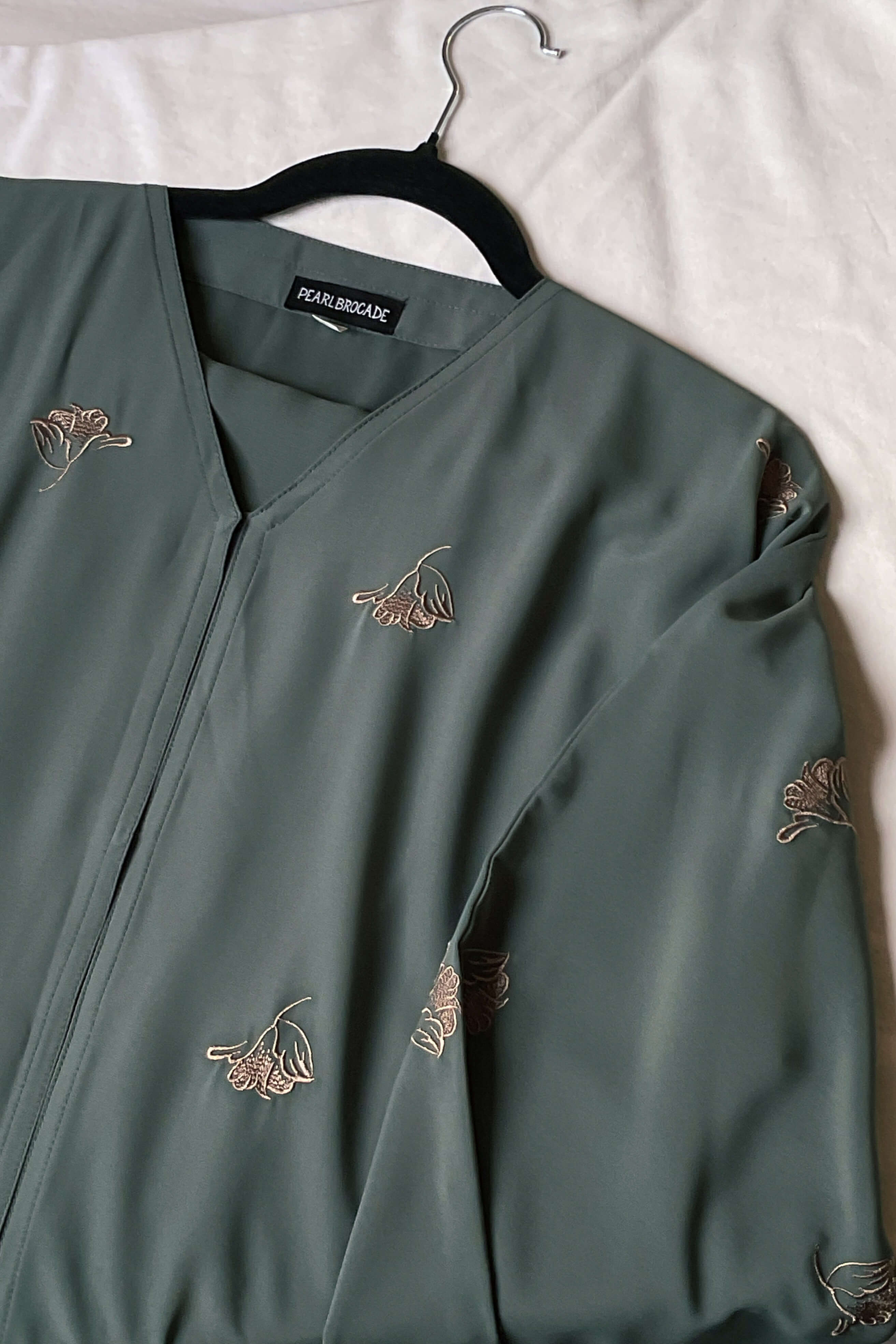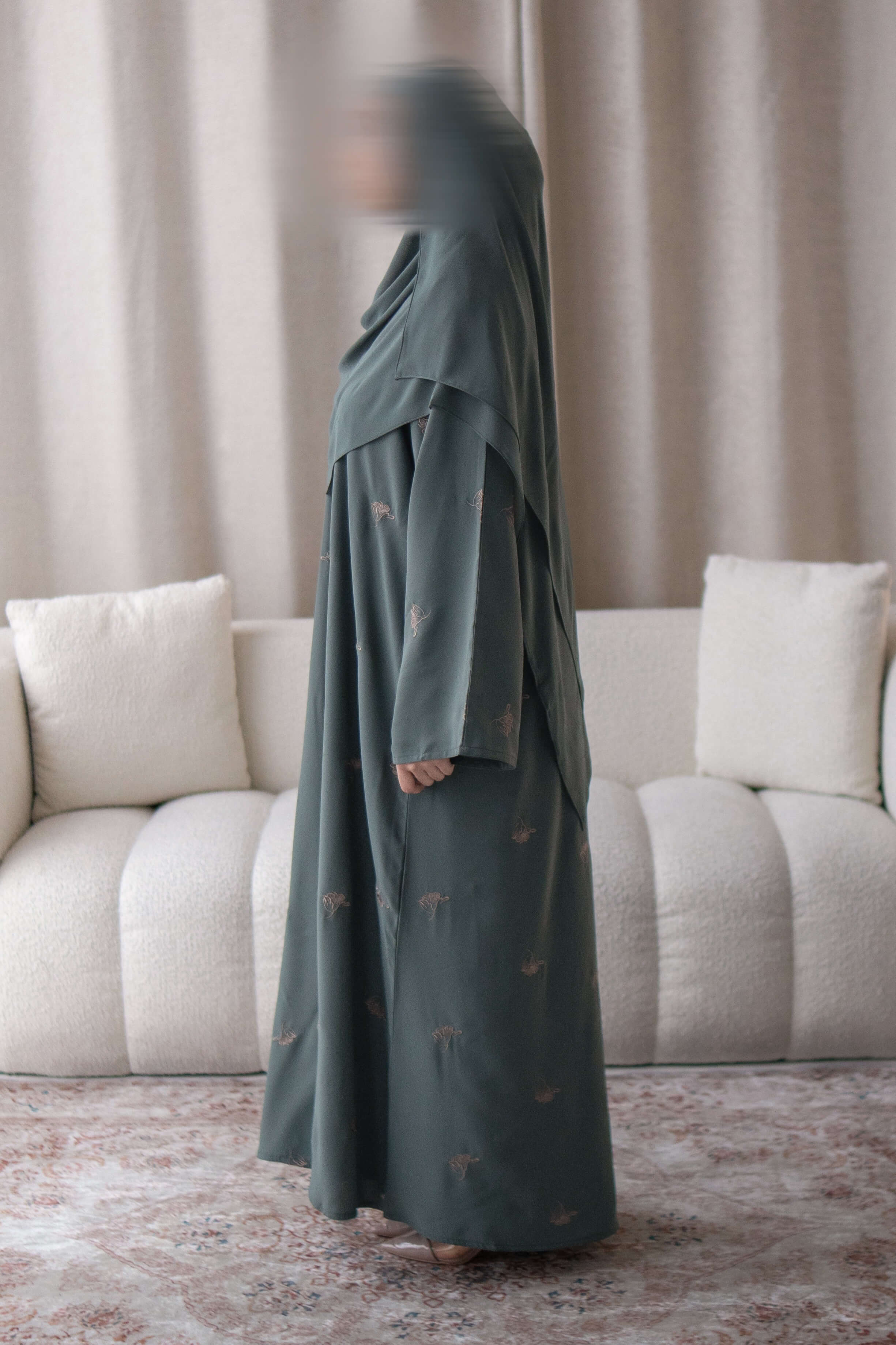 Soft flowing fabric, crafted in a vintage muted hue with subtle embroidery, a statement abaya that’s graceful in every season.