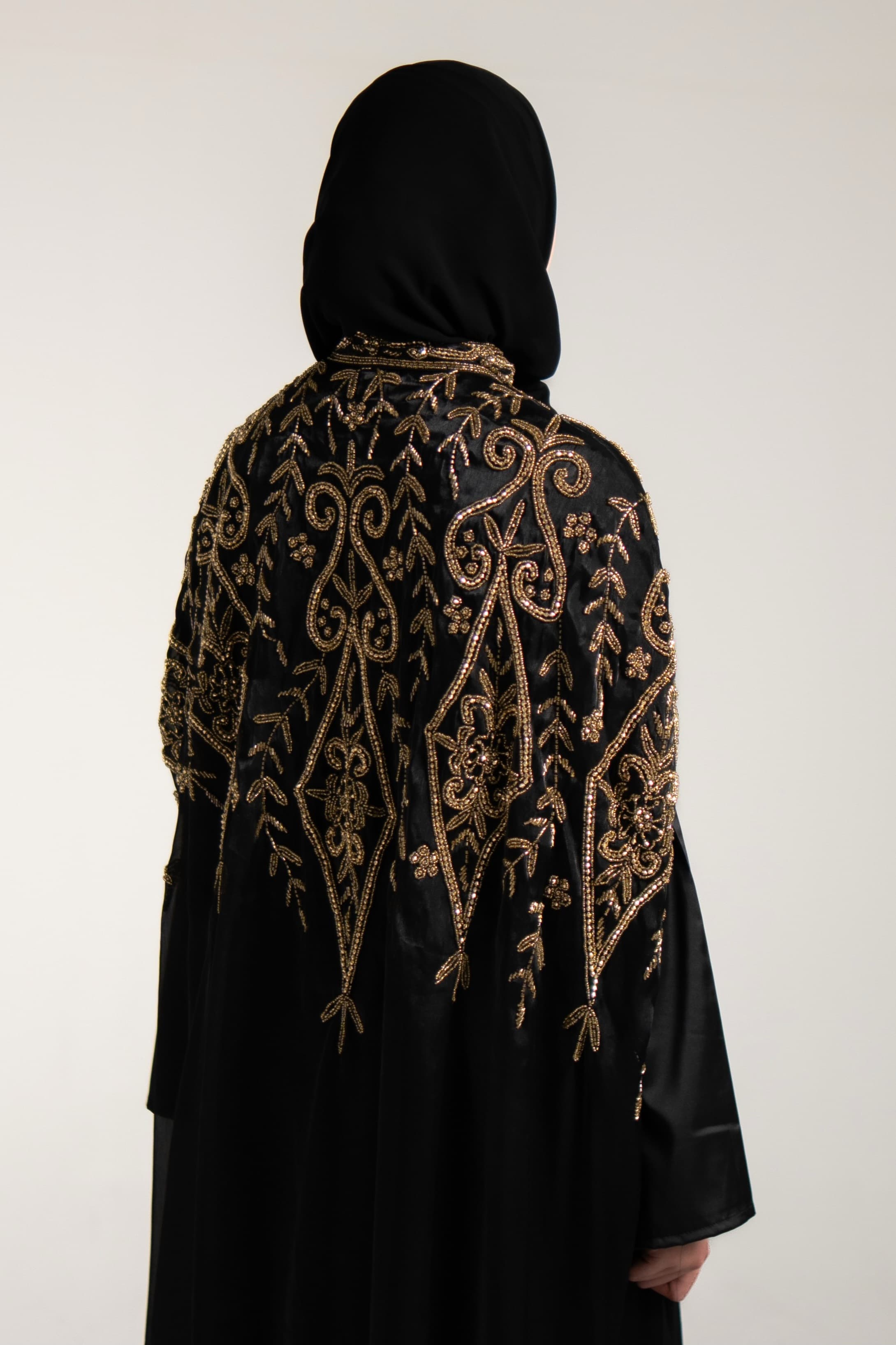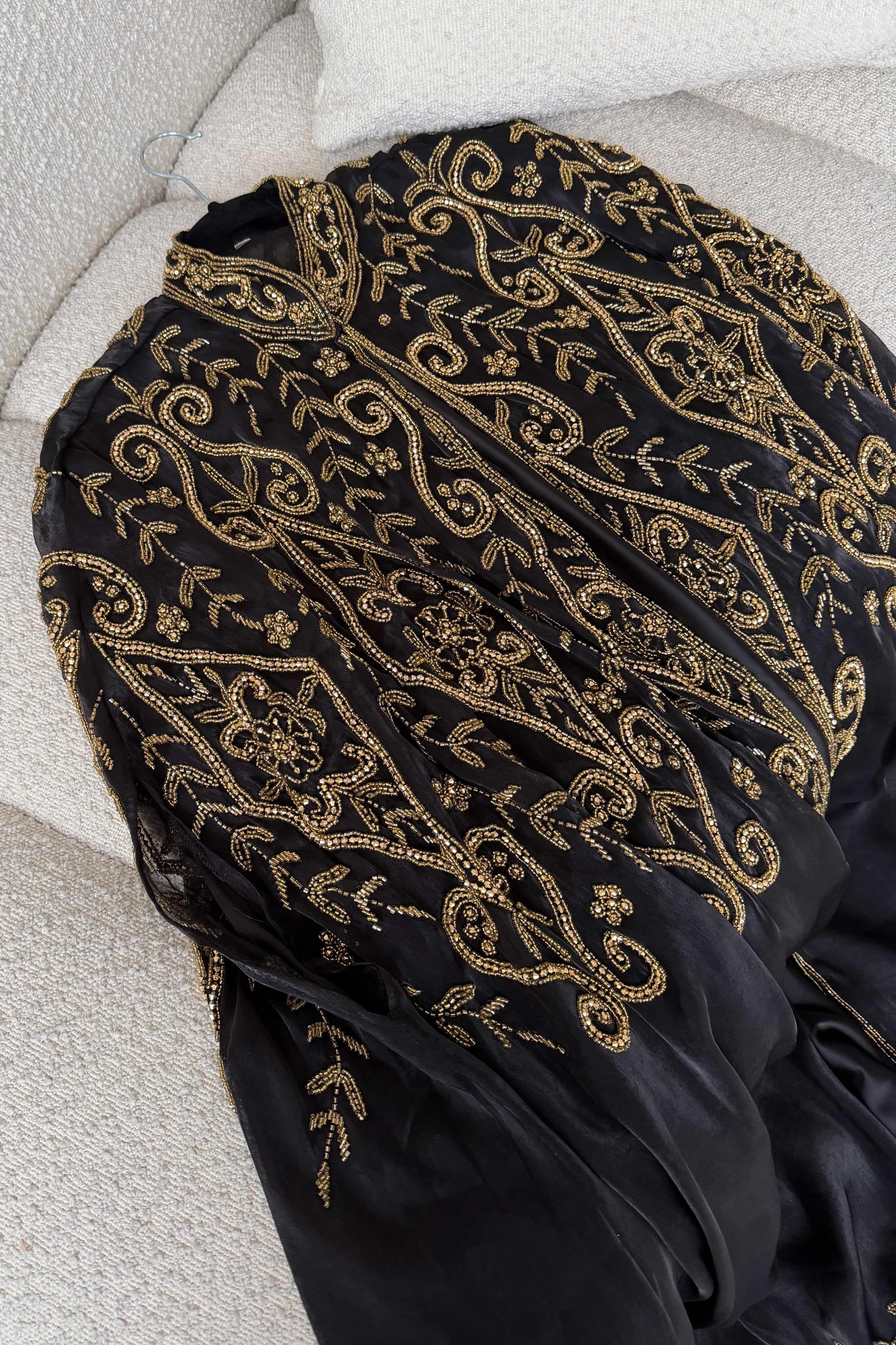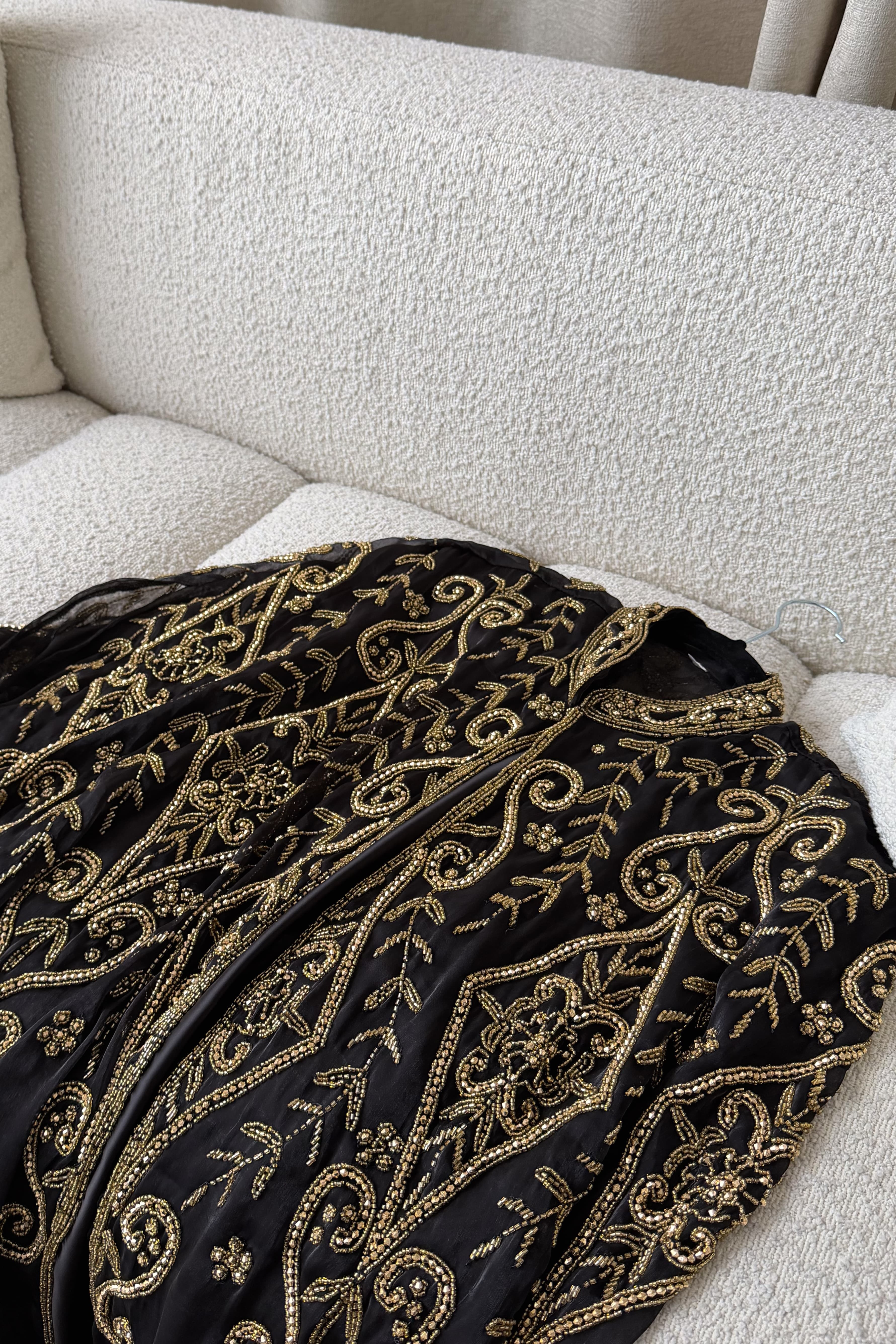 Crafted in black organza silk with rich antique gold beadwork across the front and back, this cape embodies timeless elegance. It is paired with a coordinating long-sleeved inner dress in smooth satin, chosen for its luxurious finish and beautiful contrast against the sheer organza. A refined piece designed to remain elegant season after season.
