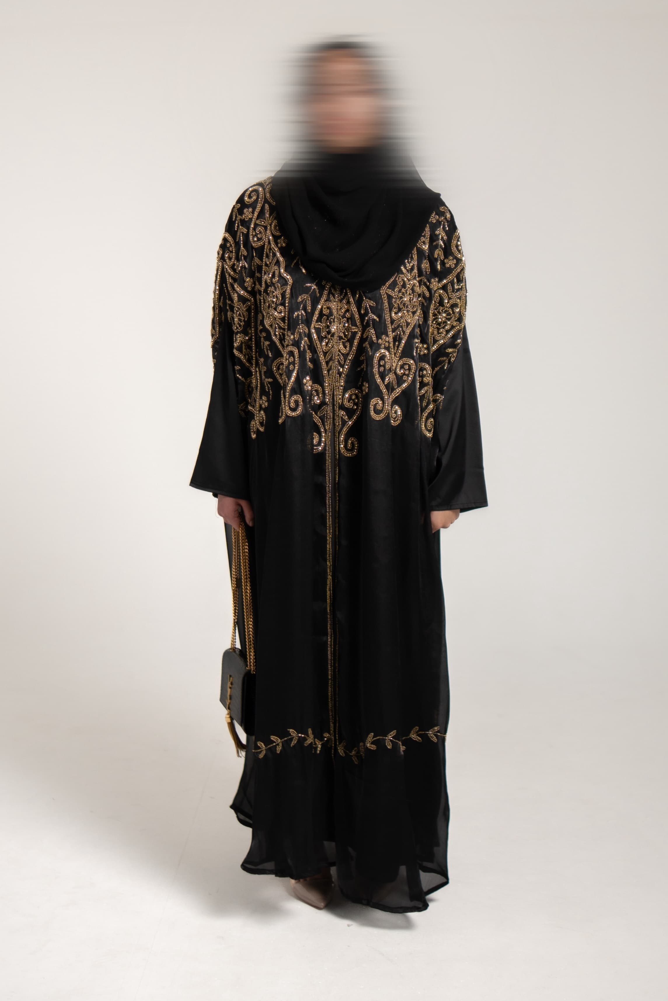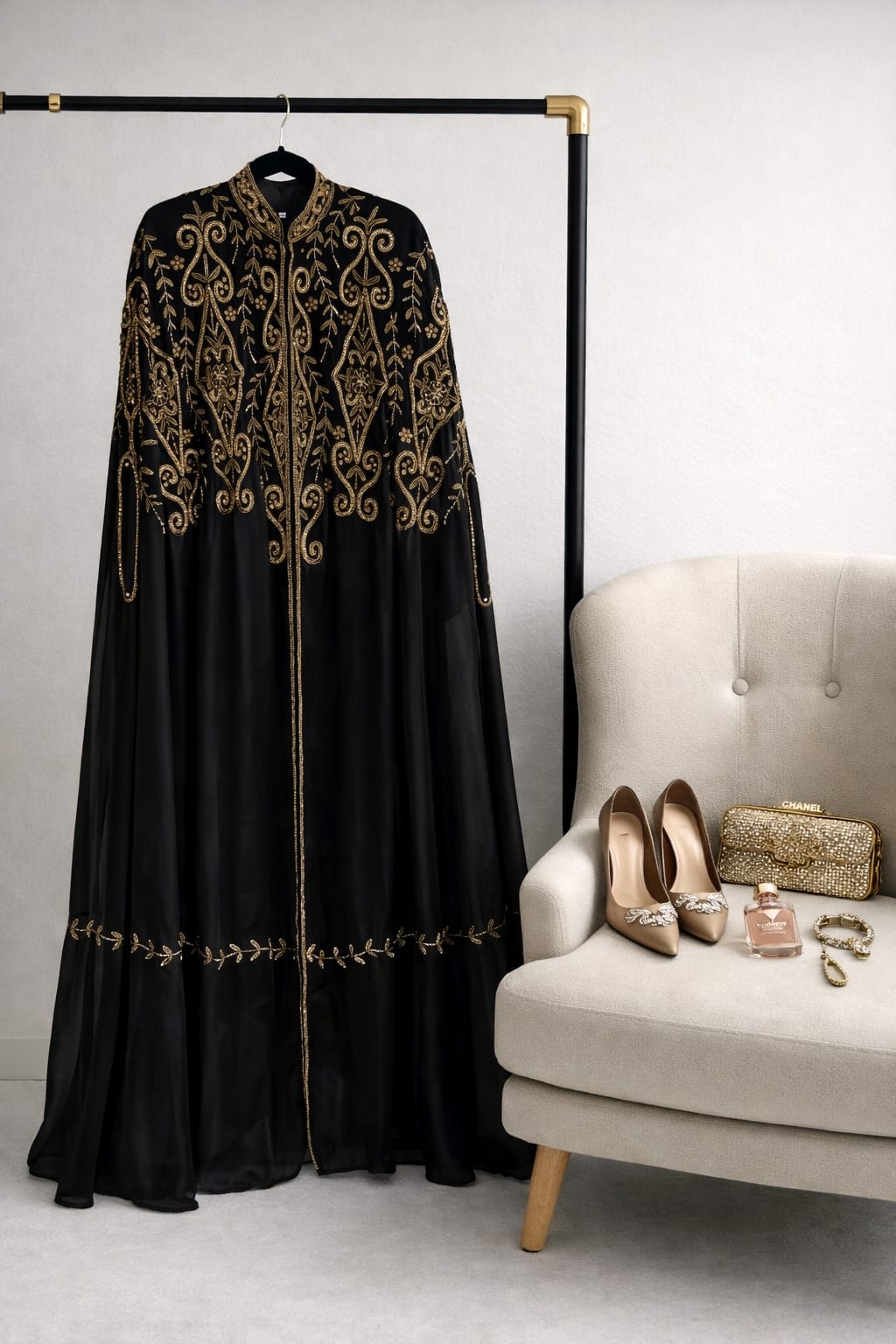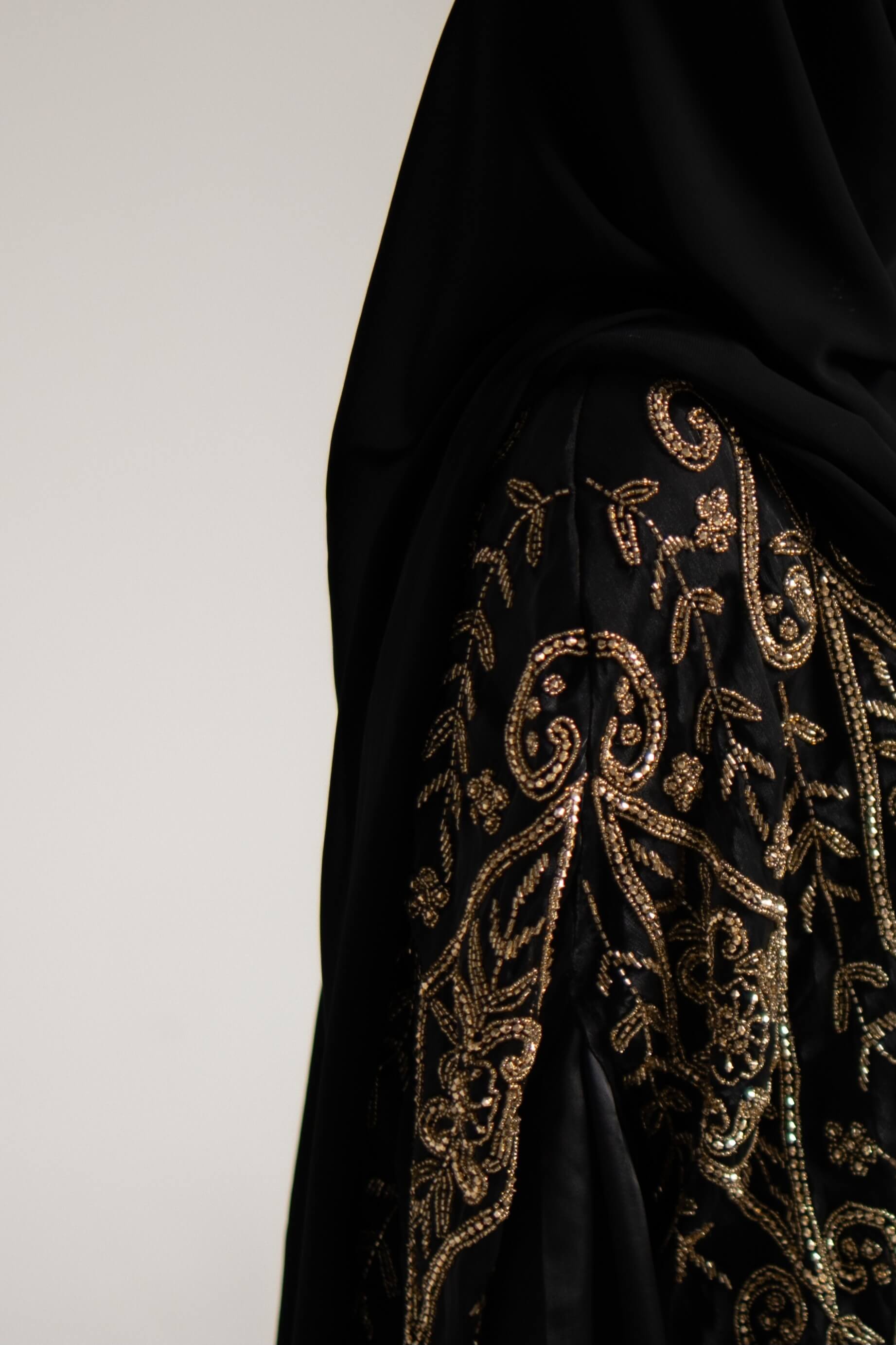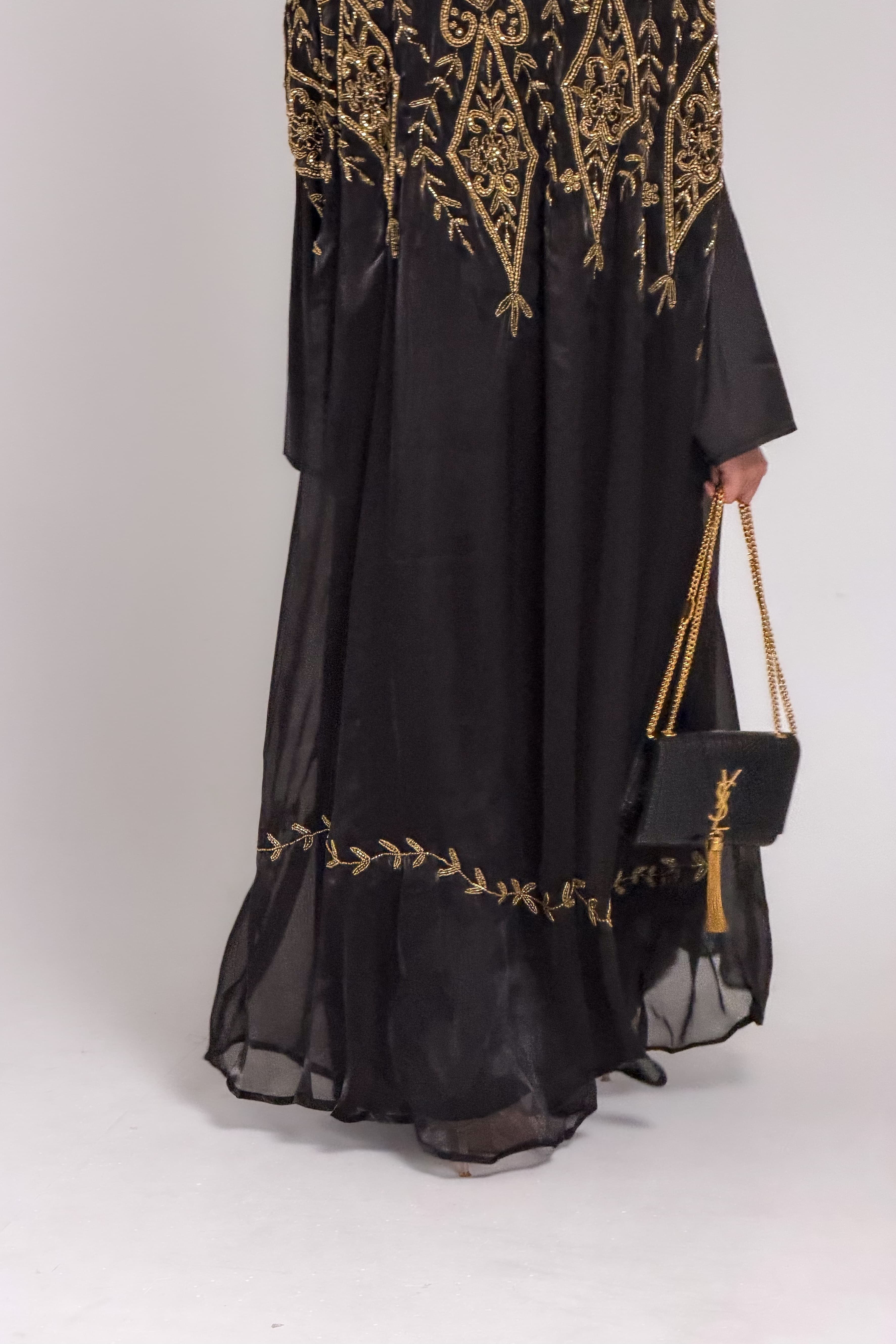Crafted in black organza silk with rich antique gold beadwork across the front and back, this cape embodies timeless elegance. It is paired with a coordinating long-sleeved inner dress in smooth satin, chosen for its luxurious finish and beautiful contrast against the sheer organza. A refined piece designed to remain elegant season after season.