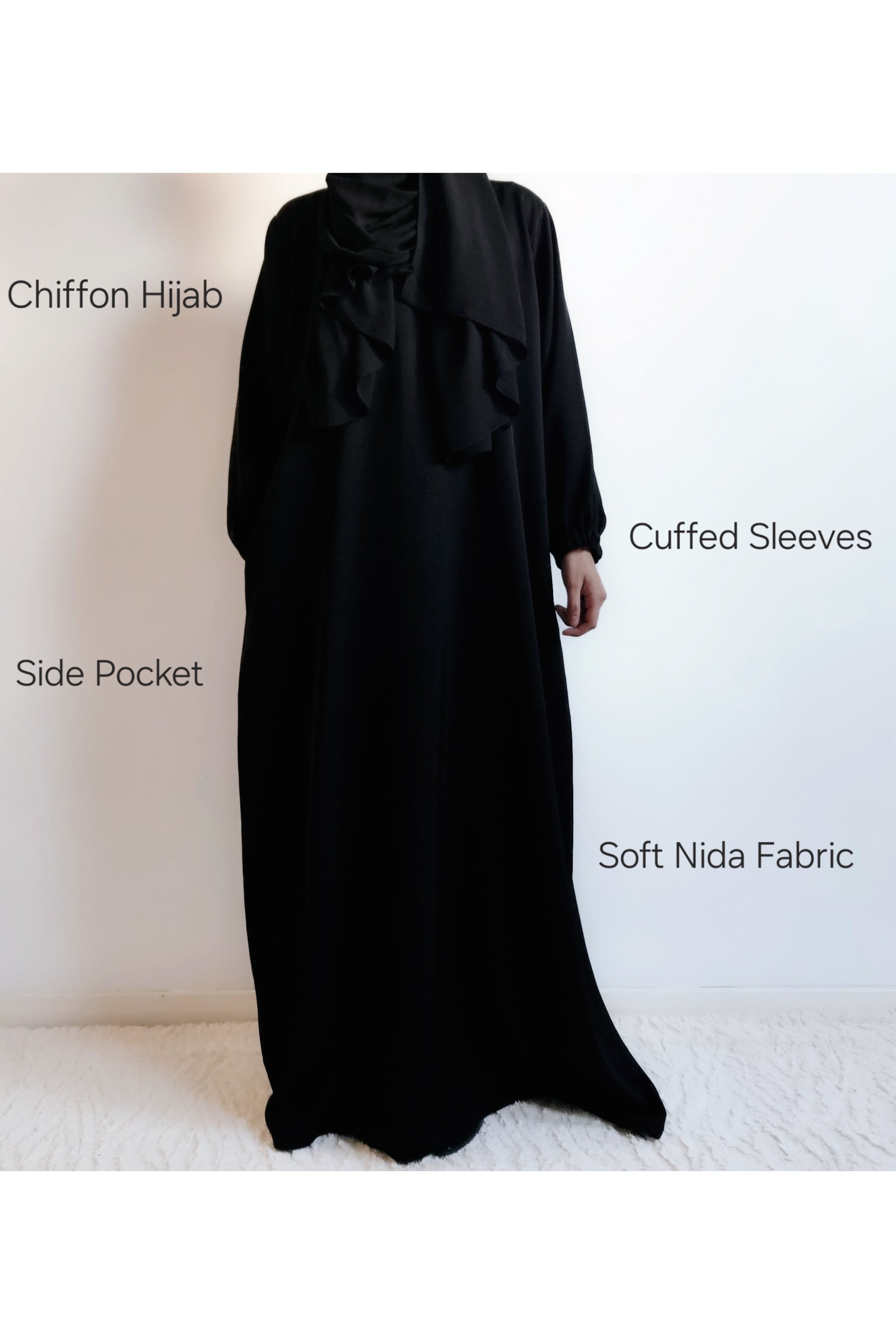 A classic staple to add to your wardrobe ideal for Ramadan/ Umrah, in soft nida fabric with cuffed sleeves, a side pocket and complementary hijab.