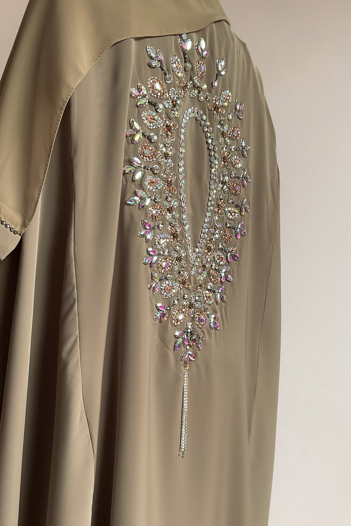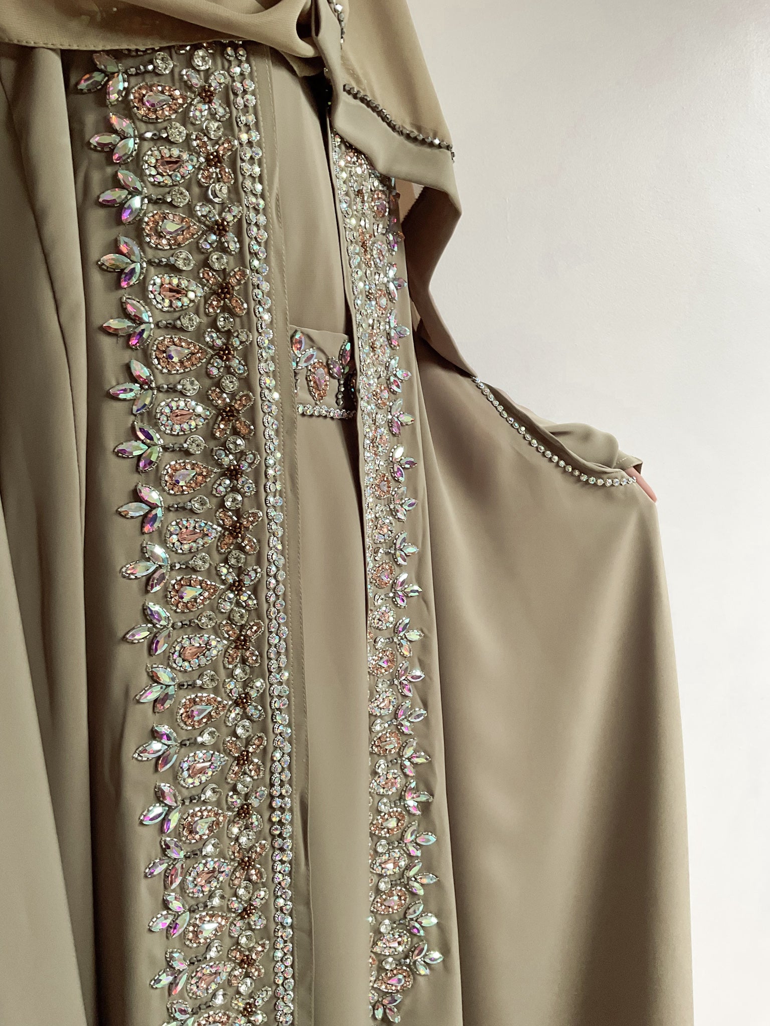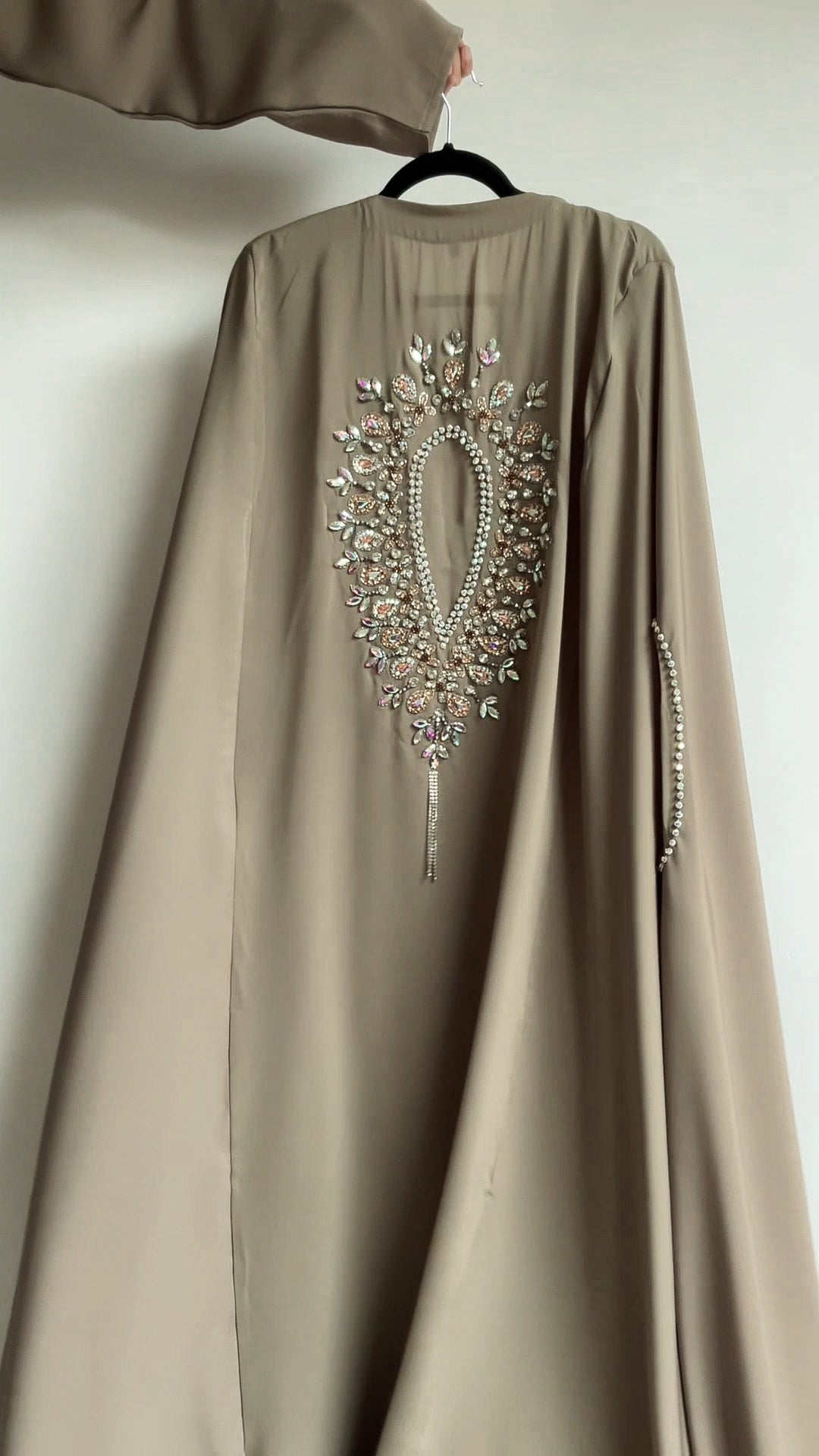 Step into elegance with this flowy, luxurious 3pc cape set along with a complementary hijab. The cape is adorned with extensive hand-beaded embellishments on the front and back.