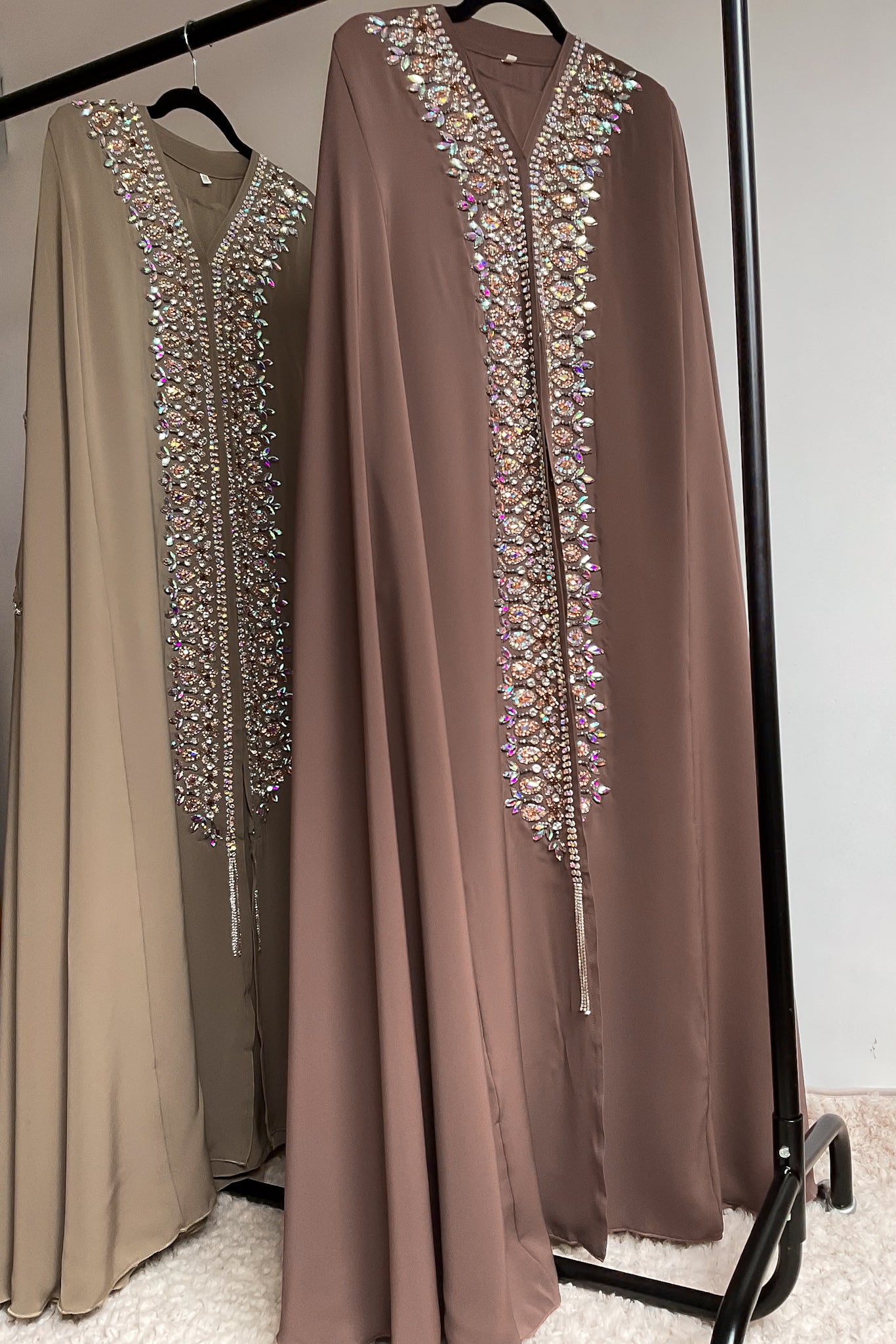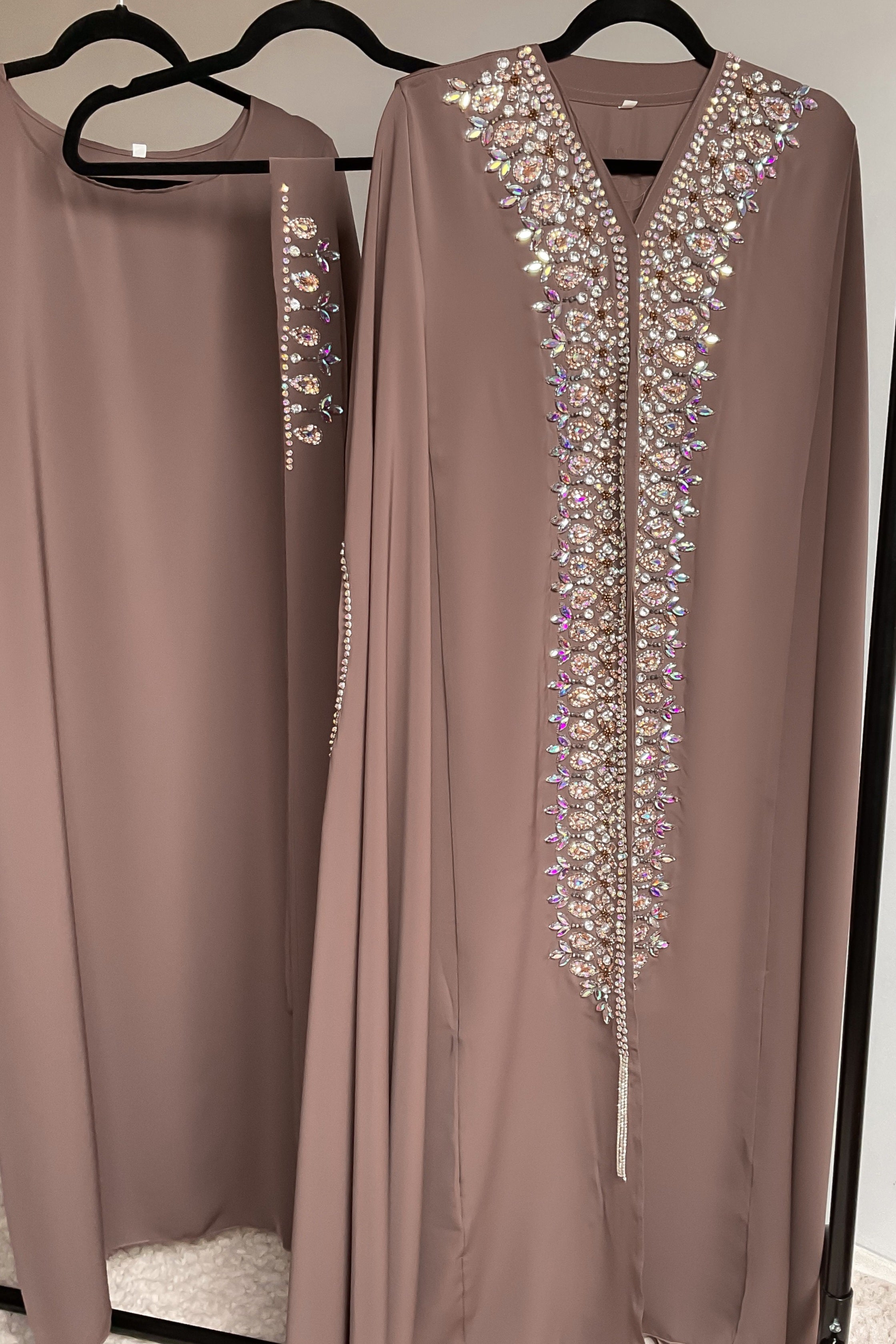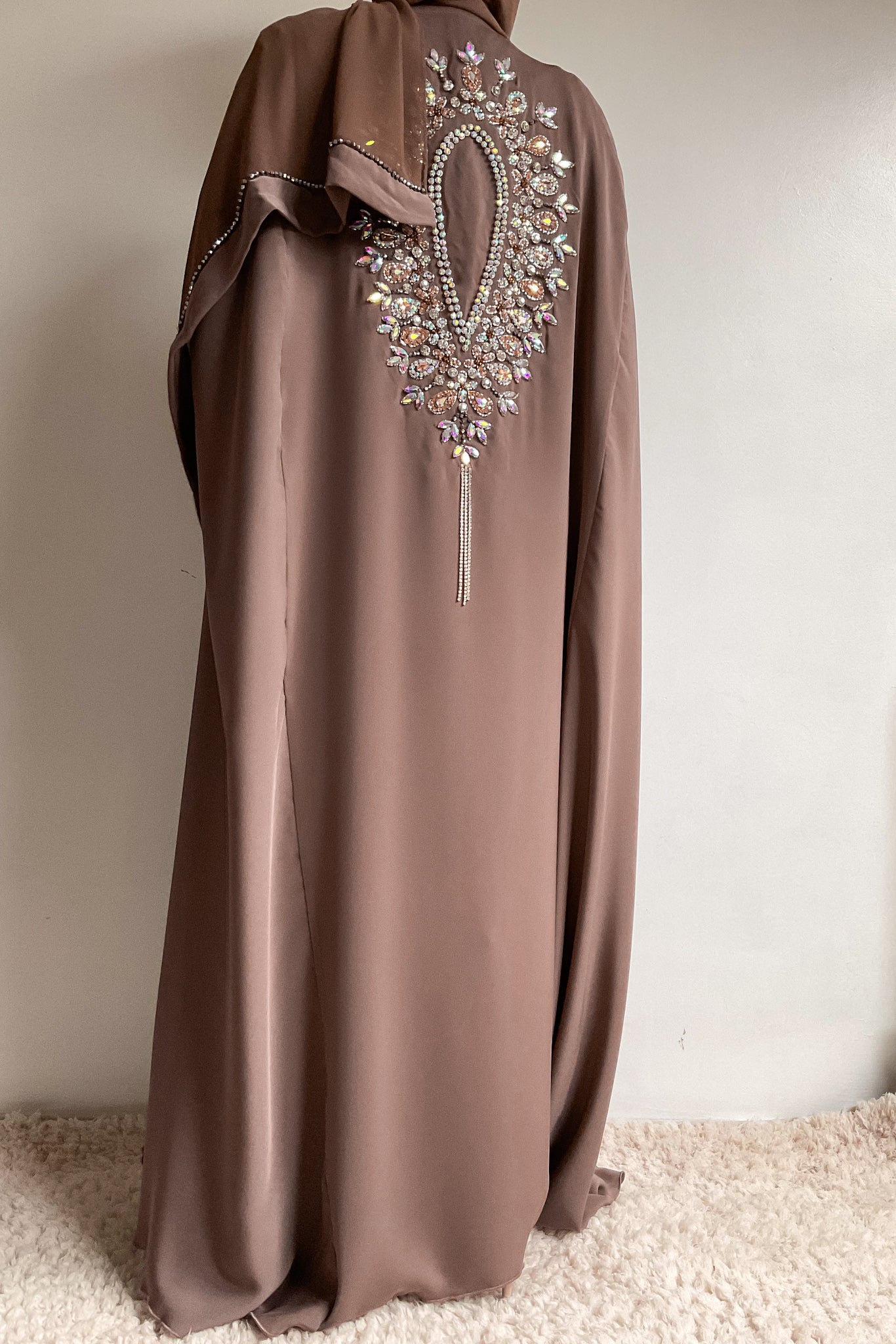 Step into elegance with this flowy, luxurious 3pc cape set along with a complementary hijab. The cape is adorned with extensive hand-beaded embellishments on the front and back.