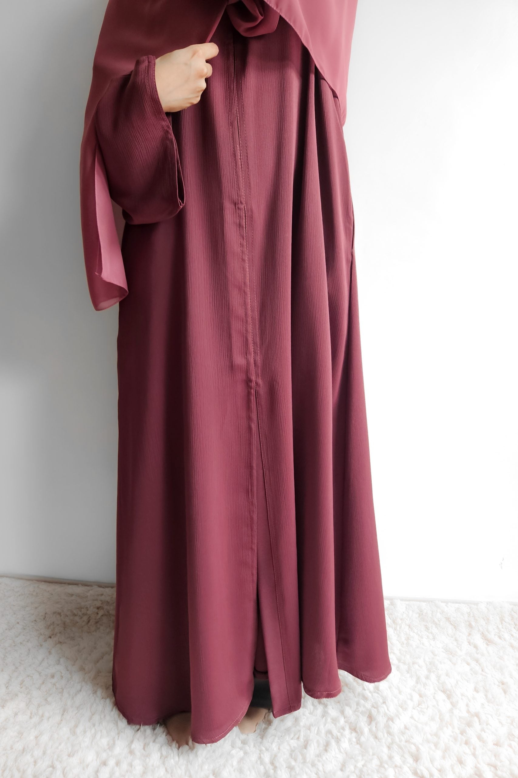 The abaya is open with buttons approximately half way down