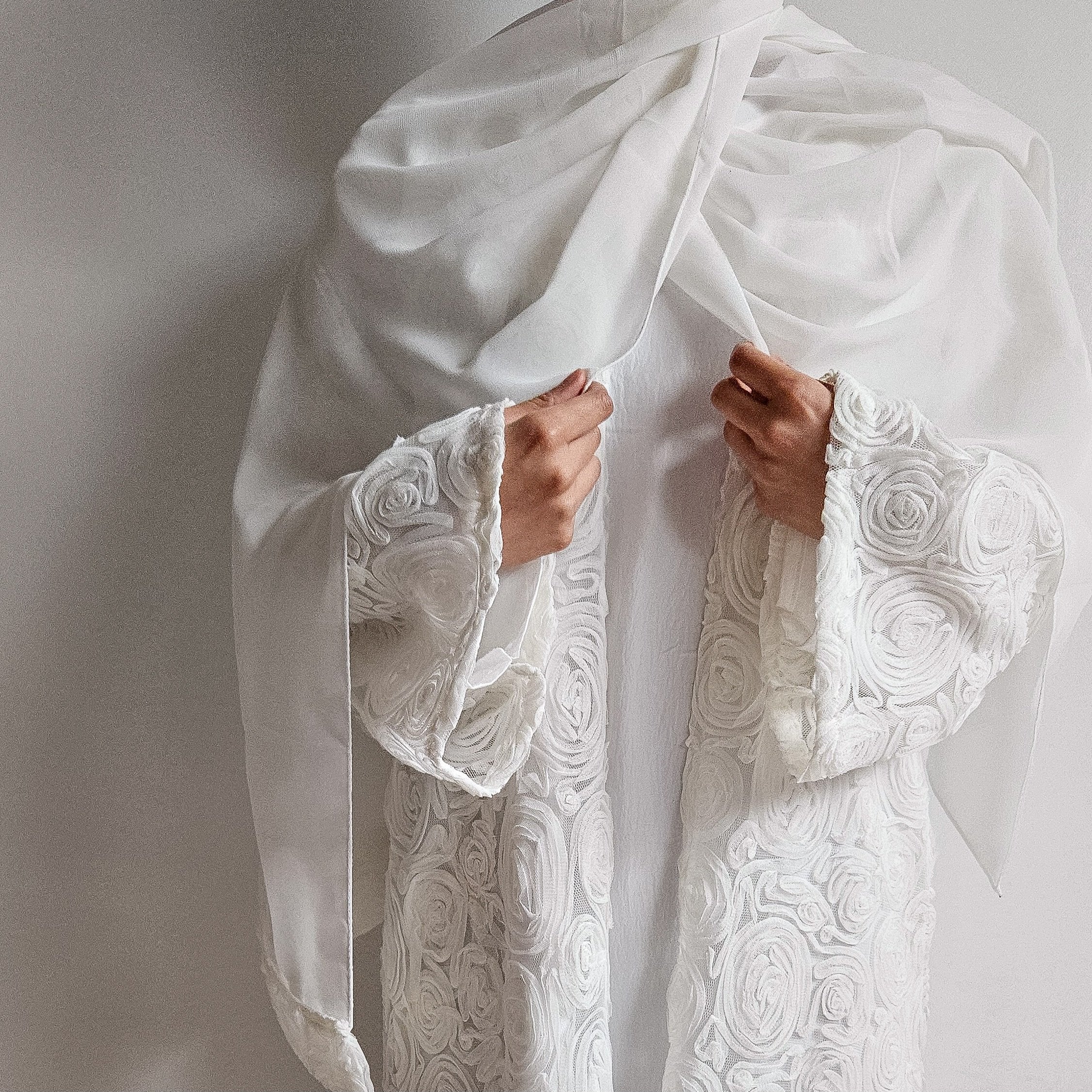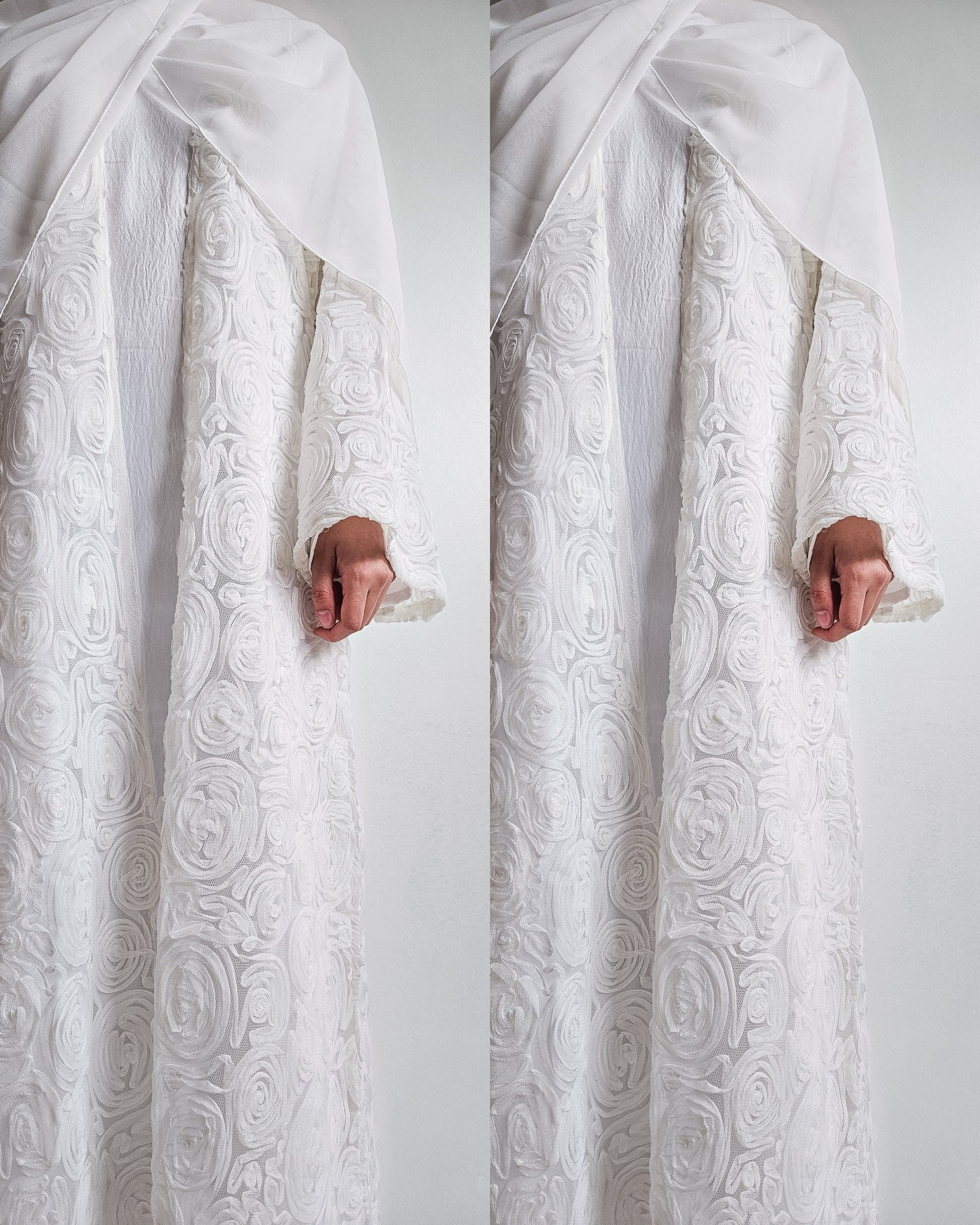 Introducing the Warda abaya, a stunning piece of occasionwear. This abaya comes in a classic black and ivory colour and consists of a long sleeve inner dress and an outer floral lace abaya. The inner dress is a separate piece allowing you to pair it with other outfits aswel. We chose a premium crush crepe fabric for the inner for that extra luxurious look and feel.